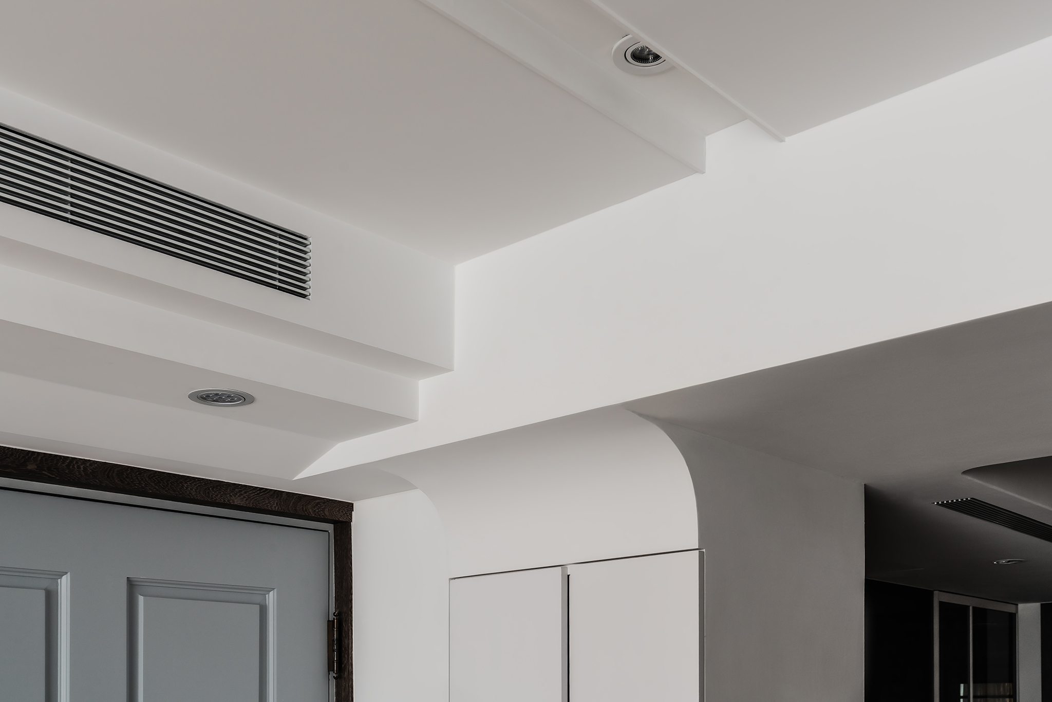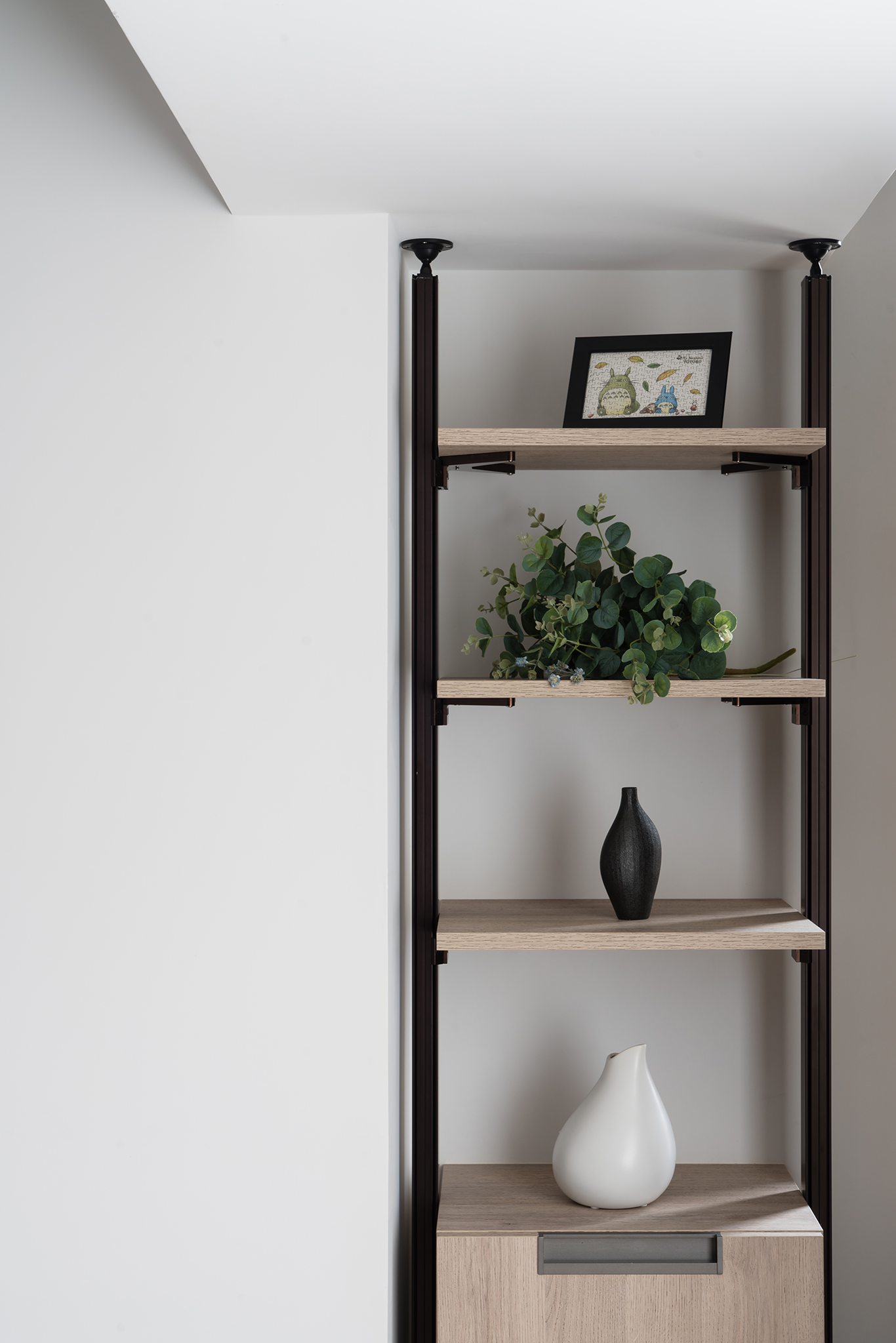 垂直收納設計雖然為小坪數住宅熱愛的收納方式,但過高的獨立櫃體卻會帶來視覺壓力,因此設計師將櫃體巧妙分割,上半部以純白系收納櫃融入天花板,以不打擾空間視覺的手法,有效發揮每個可運用的角落增添收納。