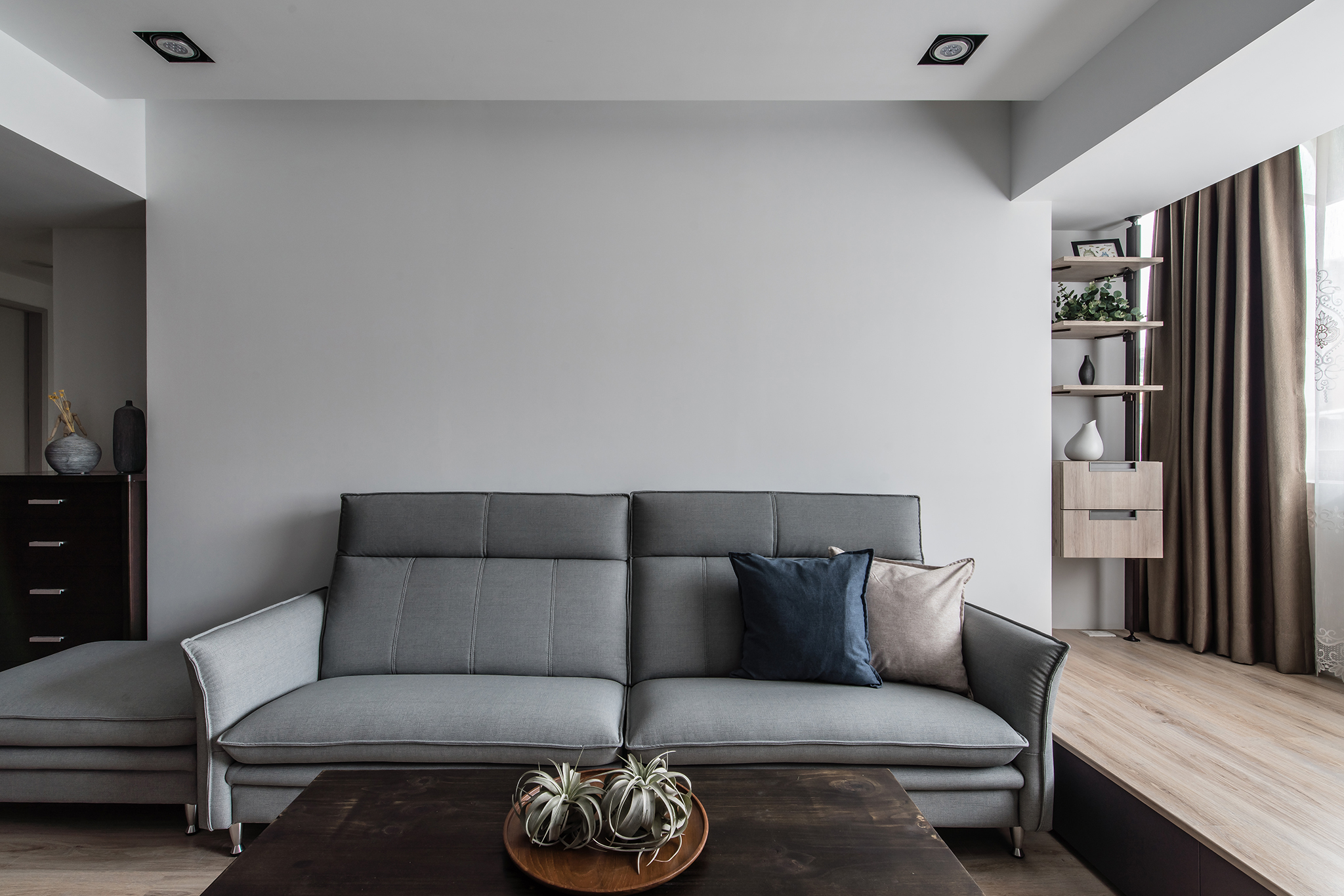 考量到居住者對於生活空間的需求,設計師捨棄了部分牆面的設置,搭配低背沙發、暗嵌式拉門等巧妙的安排,讓原本玄關沒鞋櫃、餐桌空間狹小、廚房放不下冰箱等問題一一解決。透過節省空間的設計,不只讓整體格局更為寬敞、明亮,也讓生活動線更加順暢。在色調上,整體以黑、白、灰三色為主,再搭配棕色的木質地板與櫃體,營造純樸、溫潤的室內氛圍。設計師亦採用簡約的手法佈局空間,將儲物機能藏匿其中,在滿足居住者收納需求的同時,也打造出美觀、耐看的住宅視野。