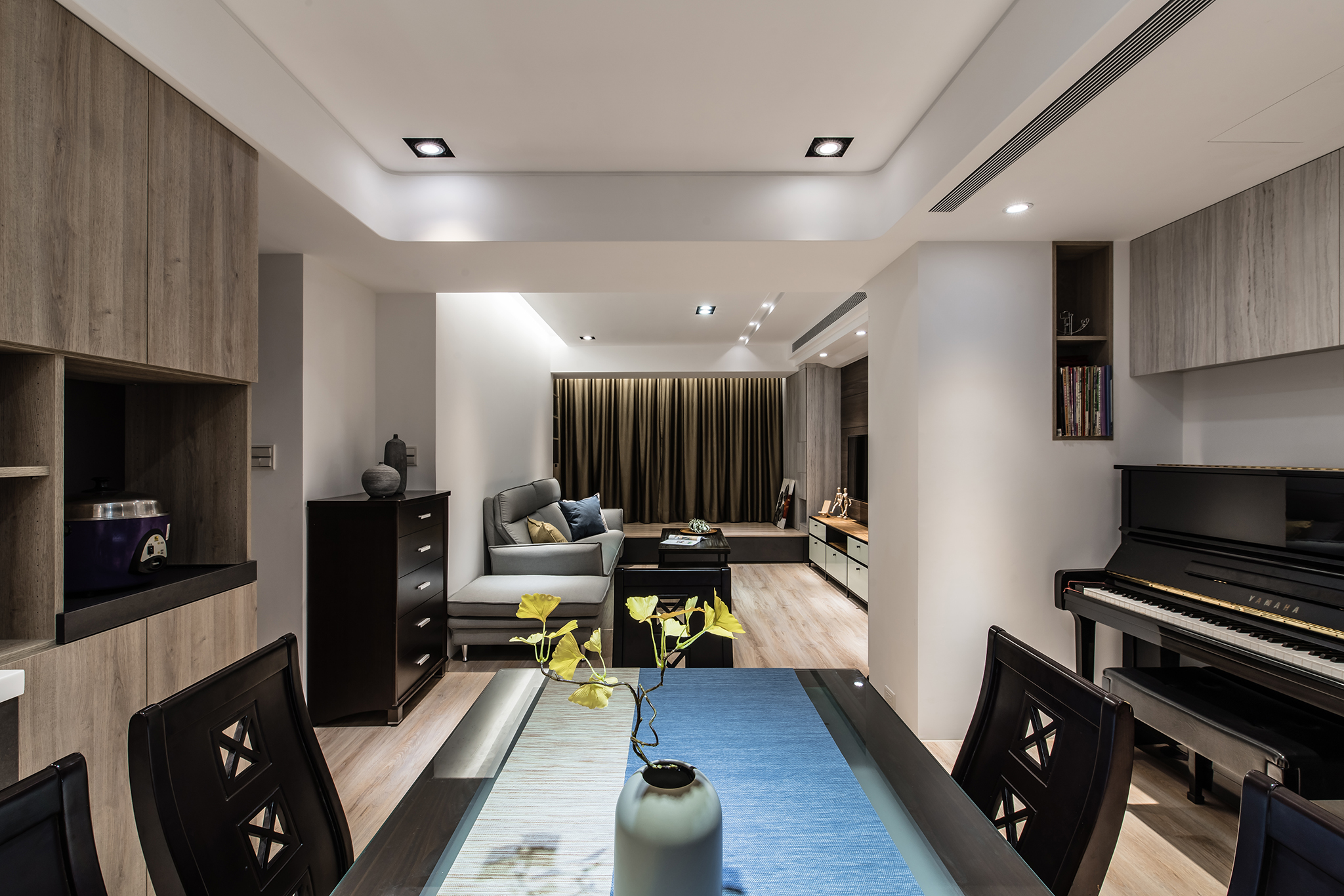 27 坪混搭風小空間,住了4個女生,需儲藏的東西多,因此收納設計絕對是這間混搭風老宅必須面對的課題!整體設計清新簡約中帶有沉穩溫暖,完整勾勒女屋主夢想藍圖,現在來看看,設計師如何為小空間打造大容量收納吧! 從生活需求規劃格局,將原格局 2 房變更至 3 房空間,釋放了一些公領域後,設計師選擇以開放式設計公共空間,並安排不同角落,讓每個成員擁有自己的舒適角落,藉此凝聚家人情感與互動。客廳區,將緊臨窗邊地坪架高,創造獨立感日光臥榻、書房休憩室,並在靠窗角落打造獨立高櫃、開放設計收納架,為公領域擴增收納機能同時不忘豐富視覺層次。小小的餐廳區,同時容納用餐及鋼琴練習區機能,而從鋼琴練習區、廚房拉門、餐桌的深色系相互搭配,打造出一氣呵成的沉穩氣息。