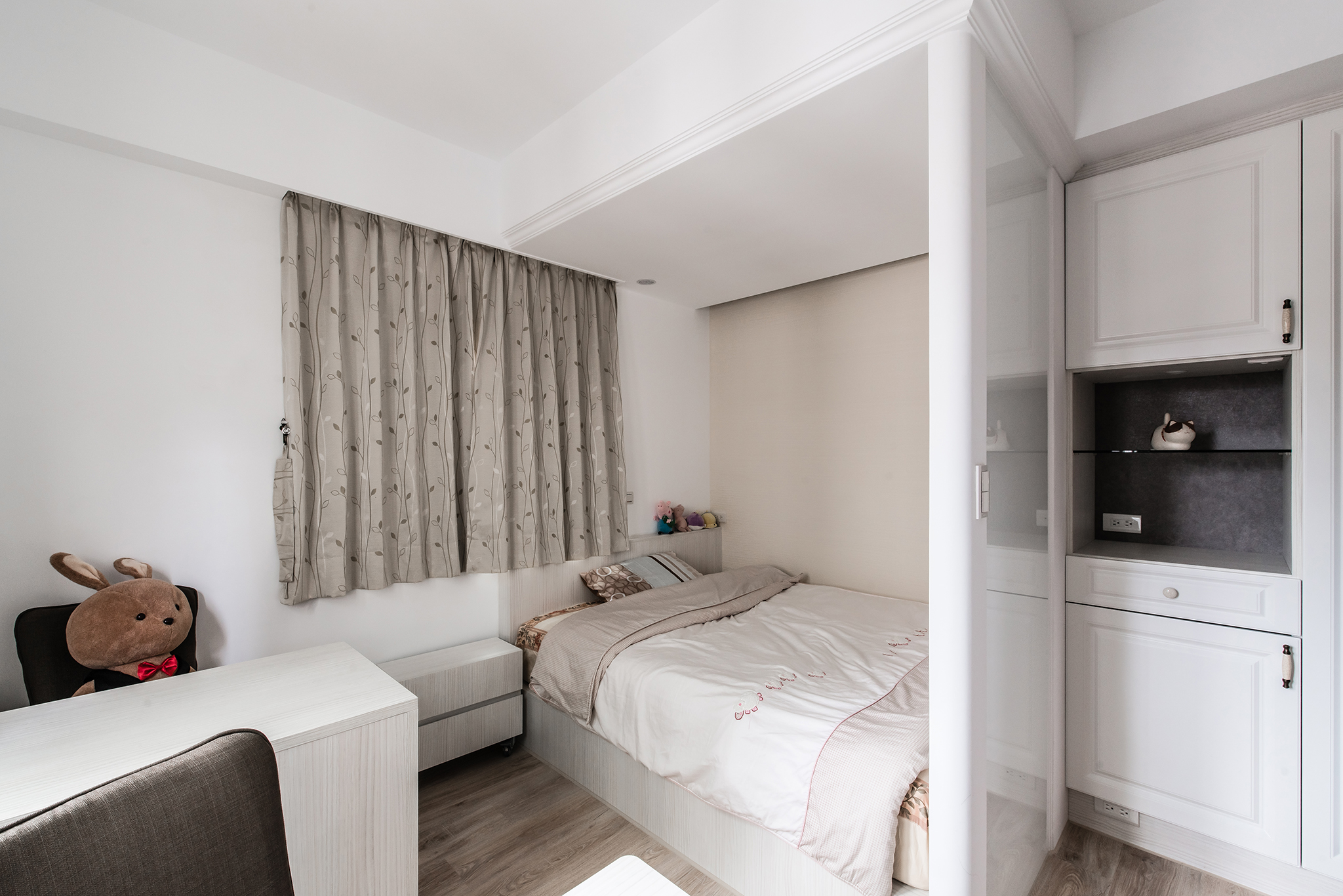 小編的最愛 不管是主臥的大容量衣櫃、書桌轉角收納、移動式小櫃體,皆根據每個居住者使用習慣調整,且為了滿足屋主對於床頭座向比照文昌位風水需求,重新調整小房間動線及配置。老房子重生後,以實用性、樂齡房屋概念,打造出一間住到退休也舒服的好宅。