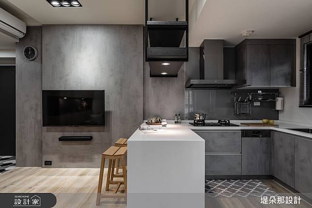開放式廚房結合中島吧檯設計,是近年來非常受小坪數歡迎的格局規劃手法,不僅省去擺放大餐桌的空間,也比傳統餐廳製造了更多用餐氣氛,能依據屋主需求轉換為下午茶、品酒放鬆區,或者閱覽、使用電腦的工作檯。另外,中島吧檯下方也能依具屋主收納習慣,增添收納櫃,擴增廚房或客廳領域的收納範圍。