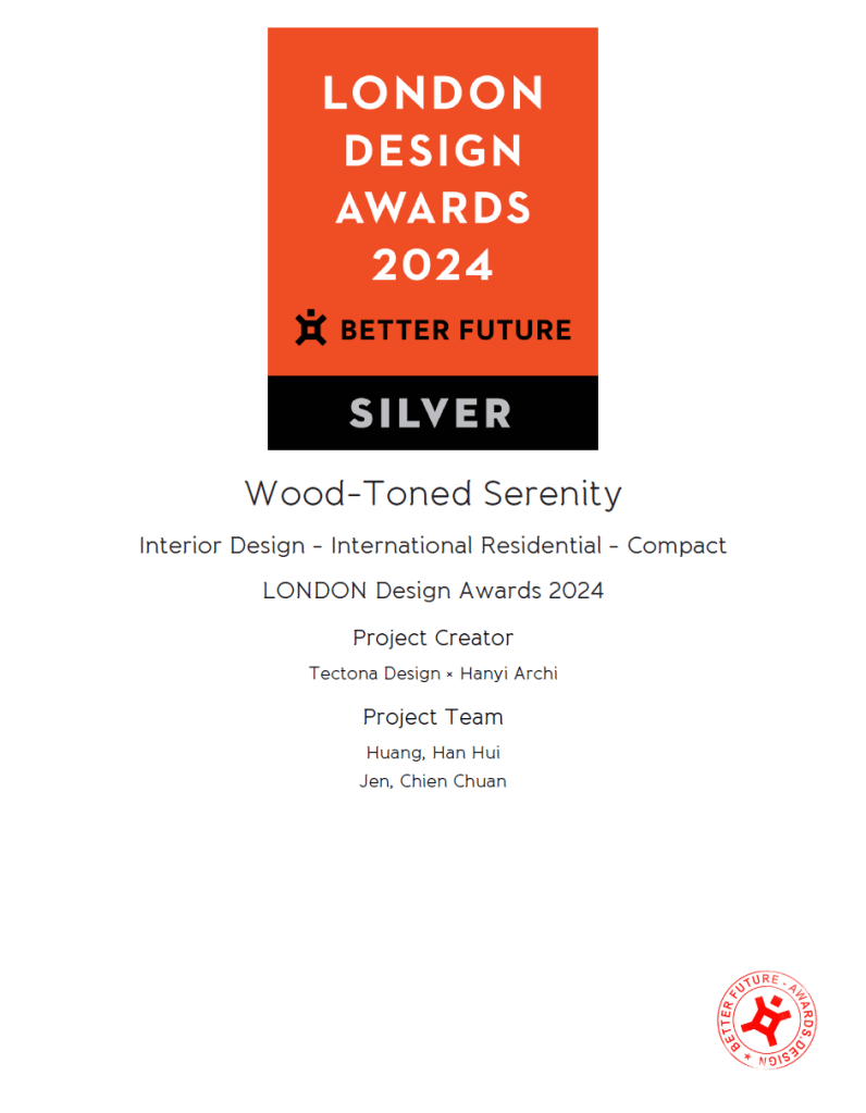 憑藉其突破性的設計特色 ,Wood-Toned Serenity 木韻|幽境 成功說服由成功說服由 131 位獨立設計專家組成的國際評審團,並在激烈的競爭中贏得青睞榮獲殊榮,獲此備受推崇的卓越設計標章。