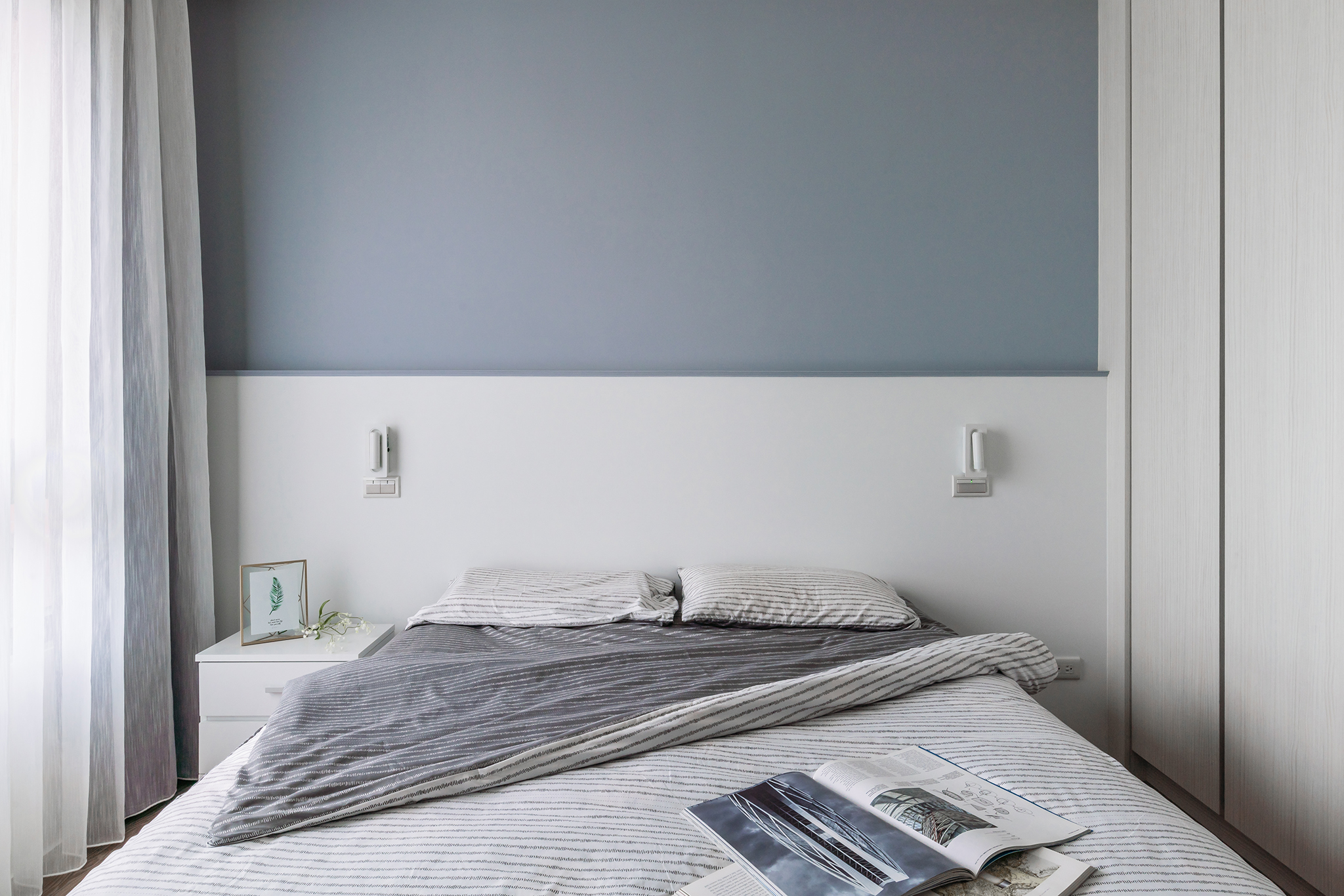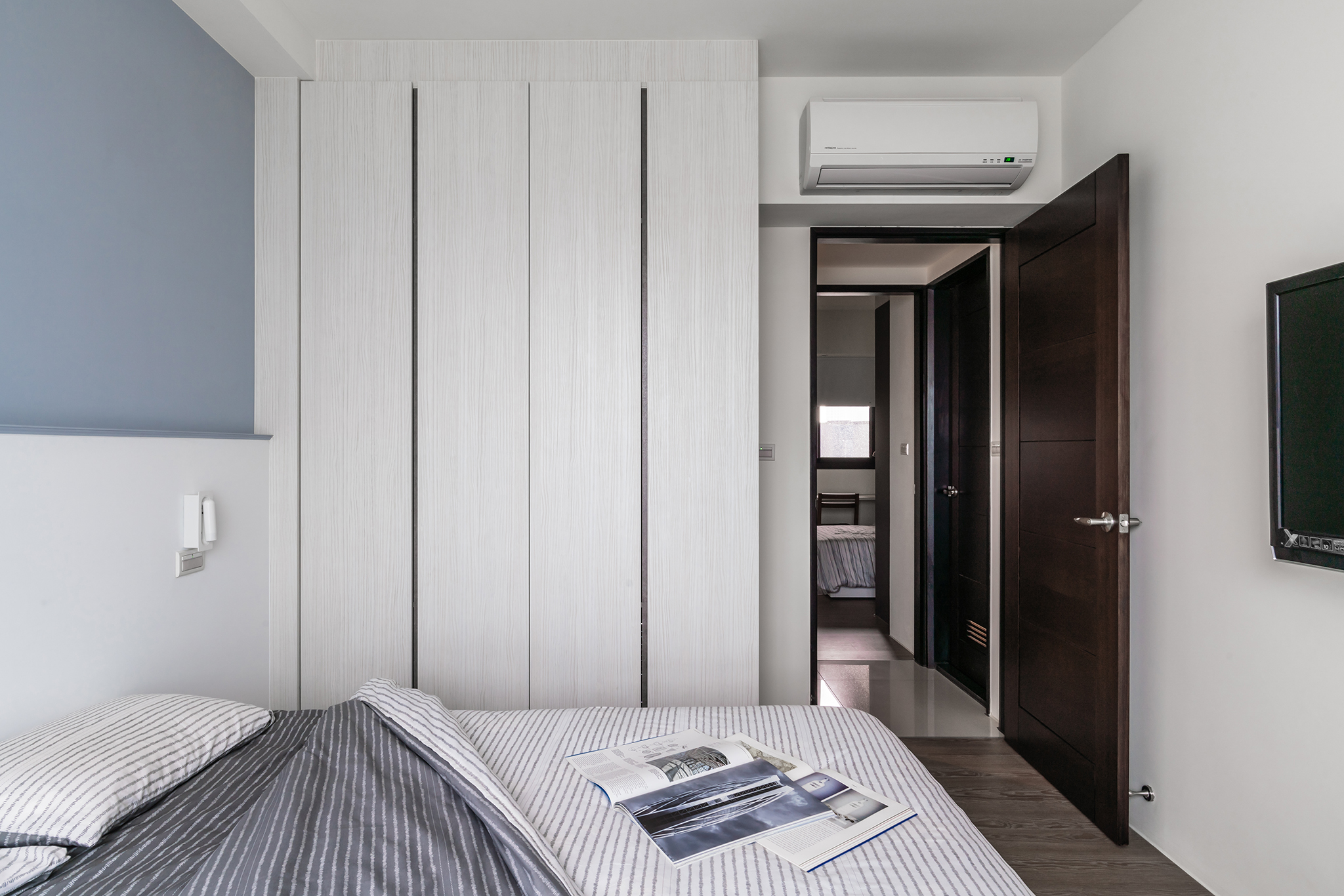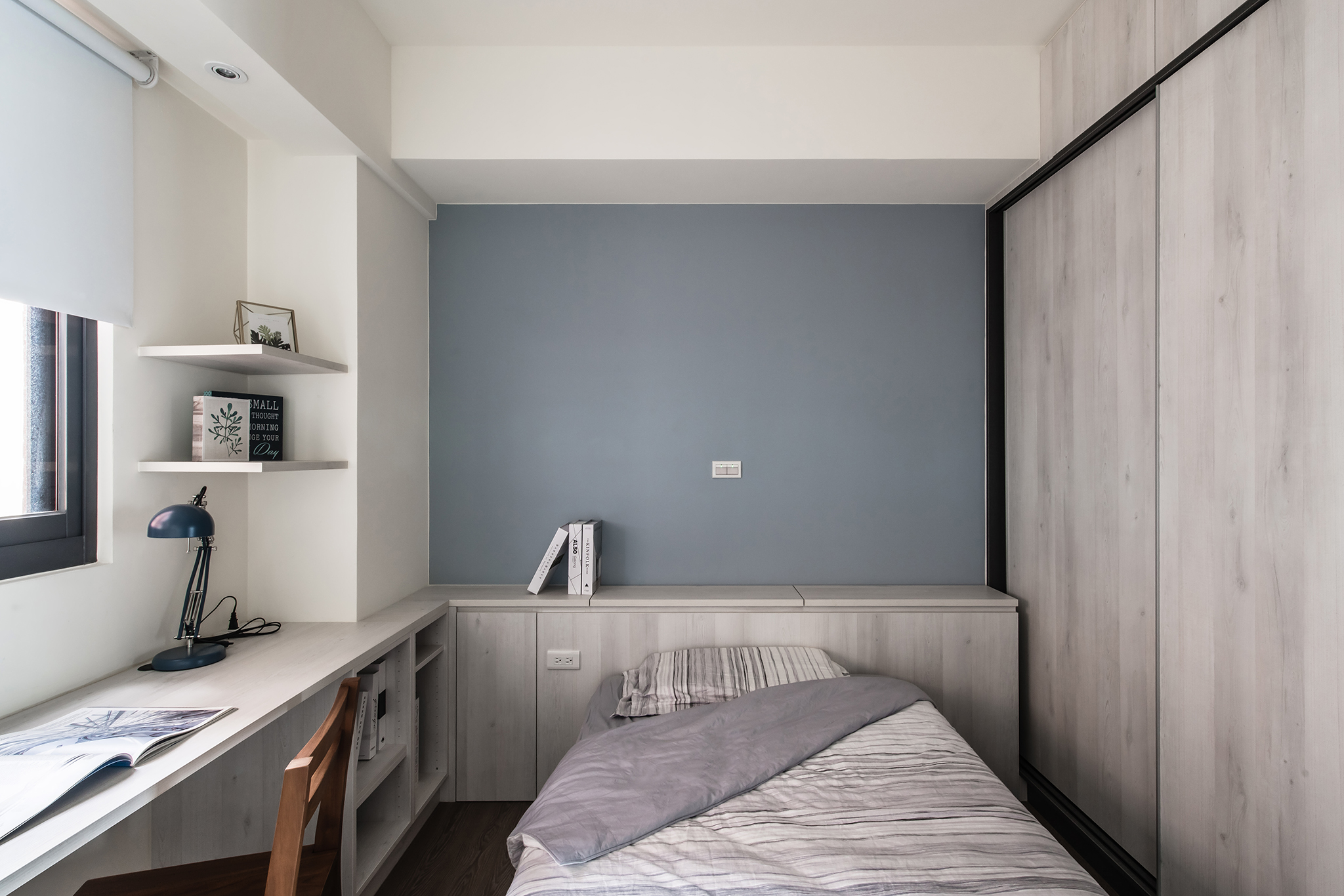 白淨簡單的空間中,設計師選擇讓沙發背牆的大面積漆上沁藍色,帶出整室空間亮點;天花板整合格局規劃,大樑作為領域間的切分點,並盡力抬升以擴增空間高度;私領域同樣帶有壓樑風水問題,設計師則以新增床頭收納櫃,化解屋主在意的床頭壓樑,同時替小空間增加更多儲物機能。