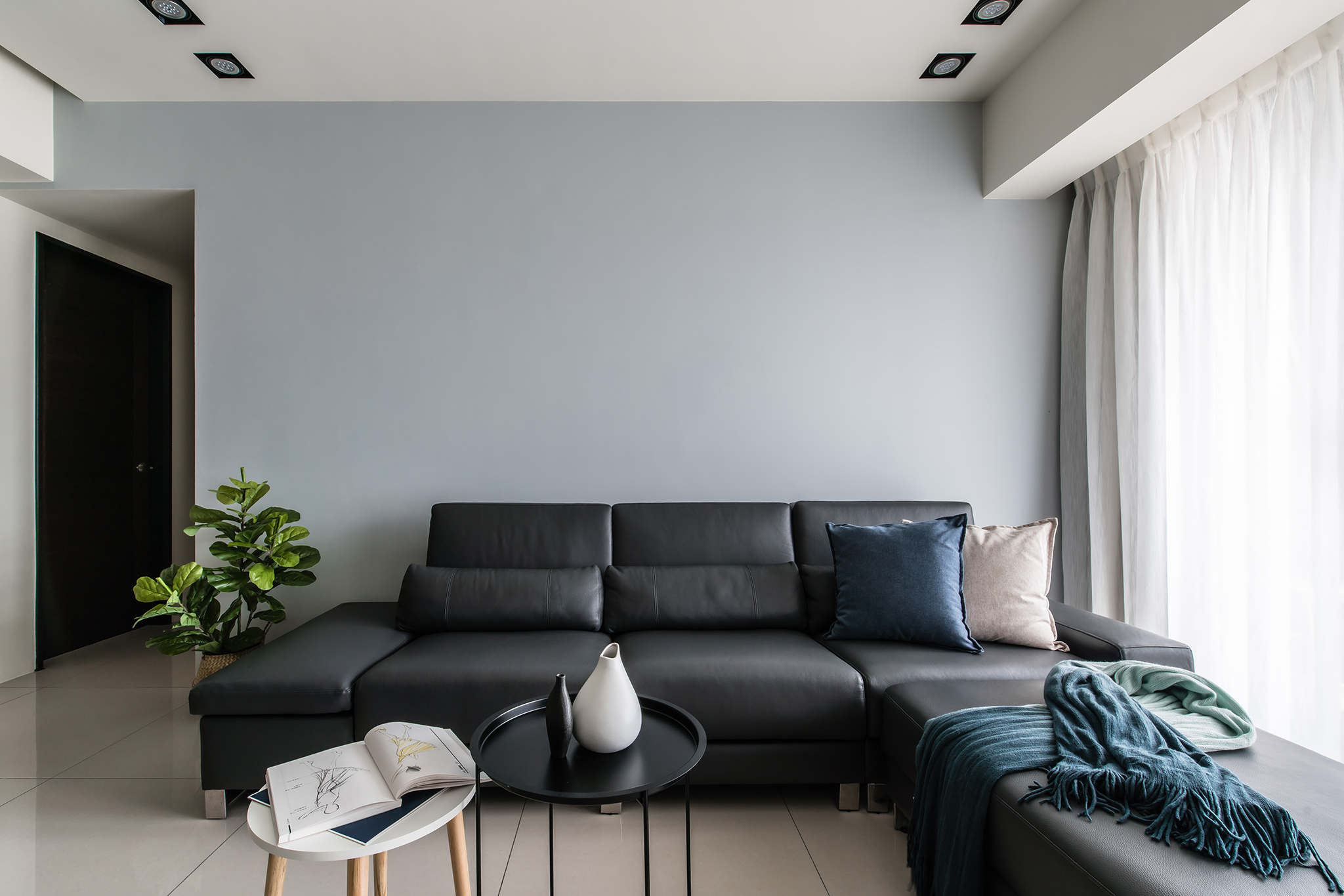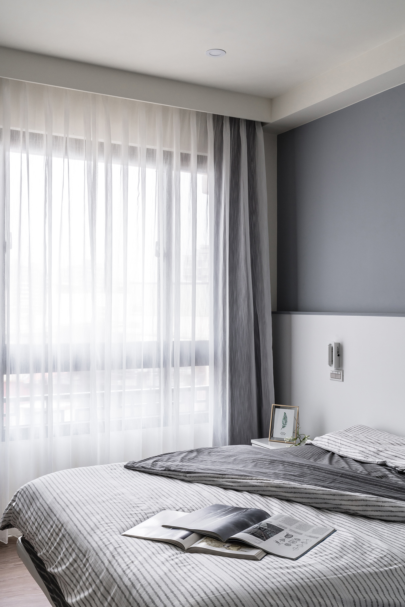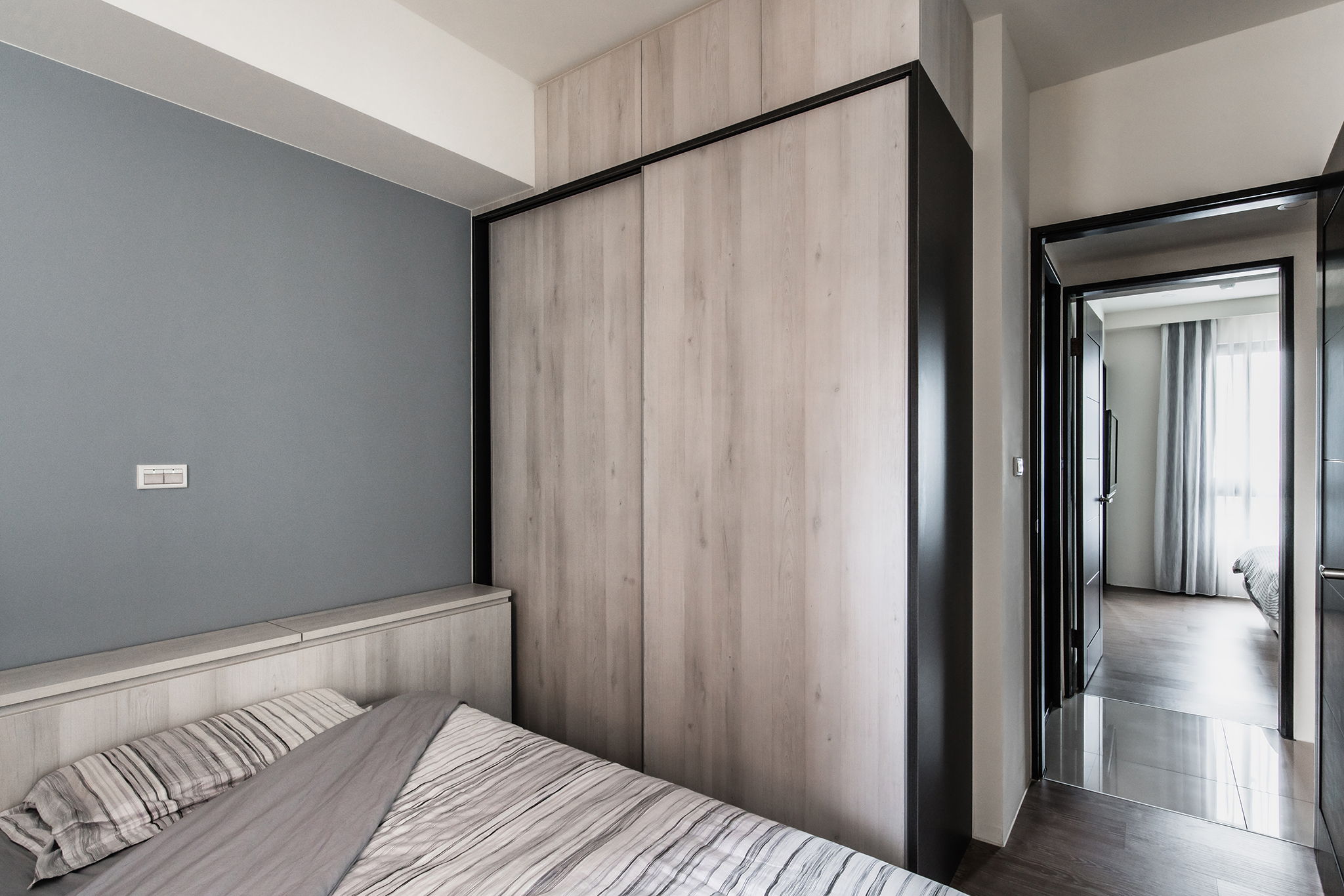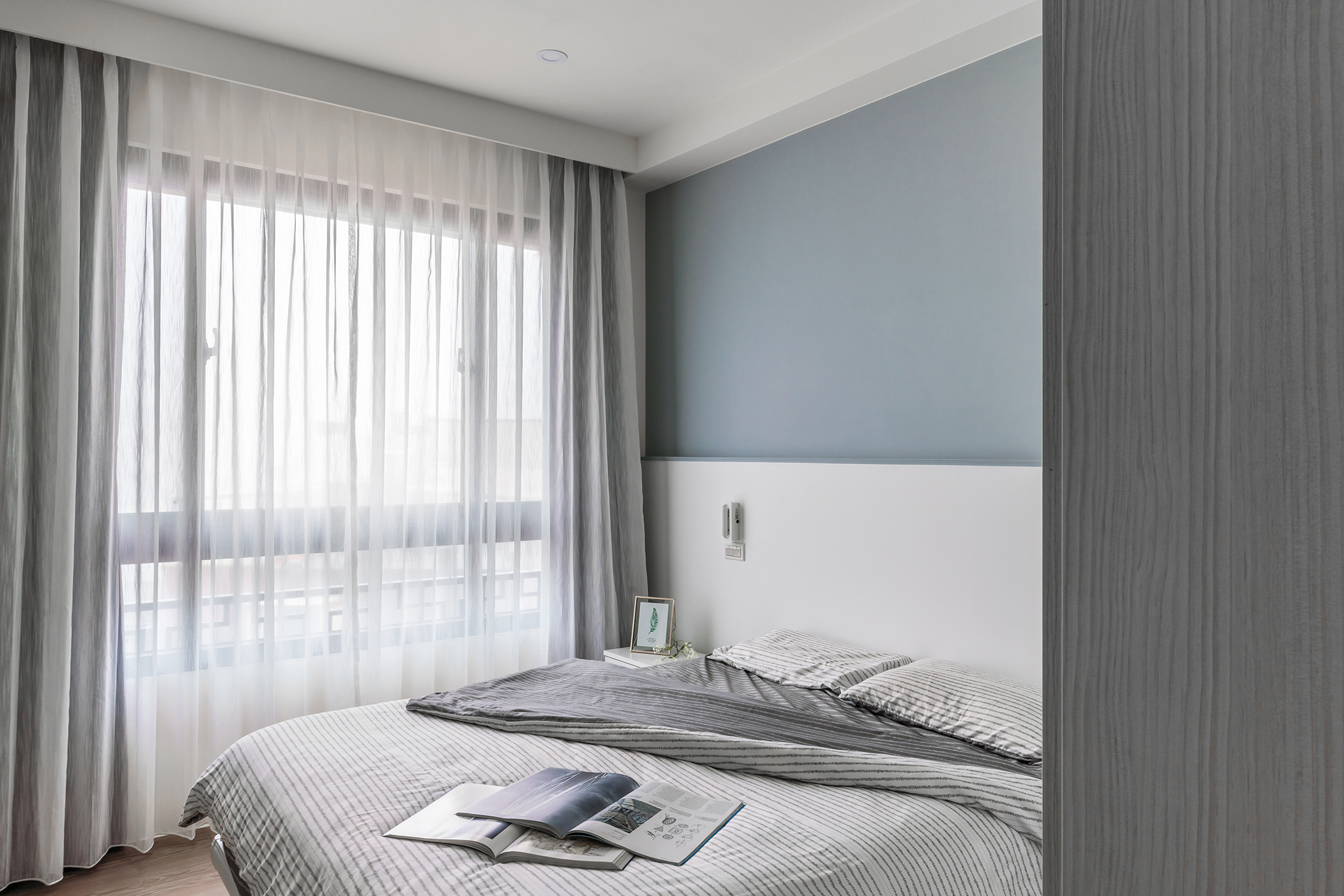 白淨簡單的空間中,設計師選擇讓沙發背牆的大面積漆上沁藍色,帶出整室空間亮點;天花板整合格局規劃,大樑作為領域間的切分點,並盡力抬升以擴增空間高度;私領域同樣帶有壓樑風水問題,設計師則以新增床頭收納櫃,化解屋主在意的床頭壓樑,同時替小空間增加更多儲物機能。