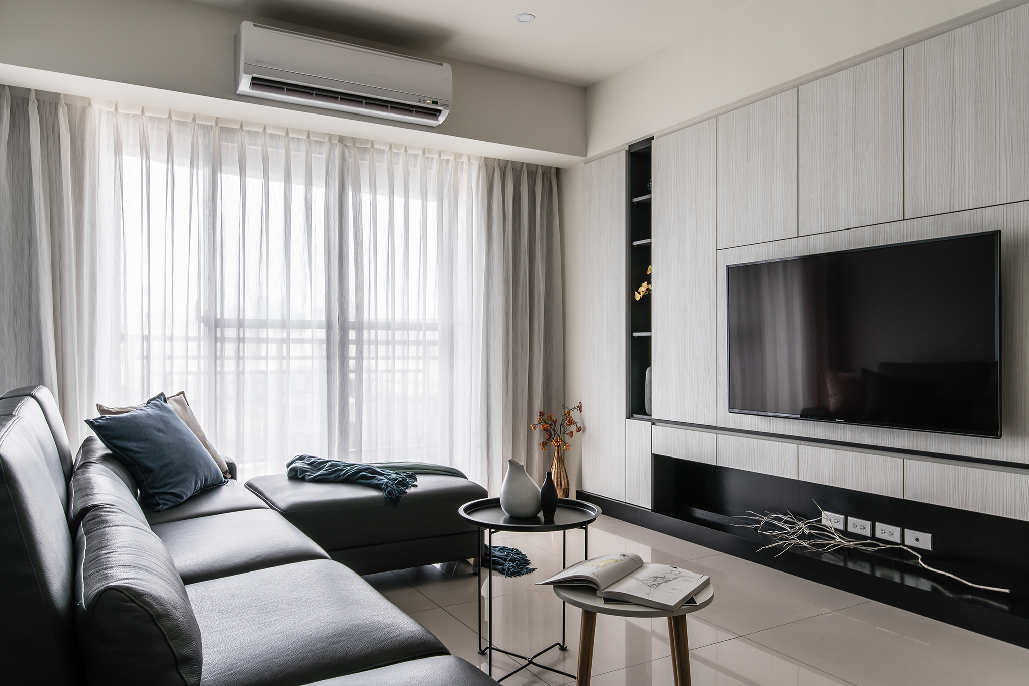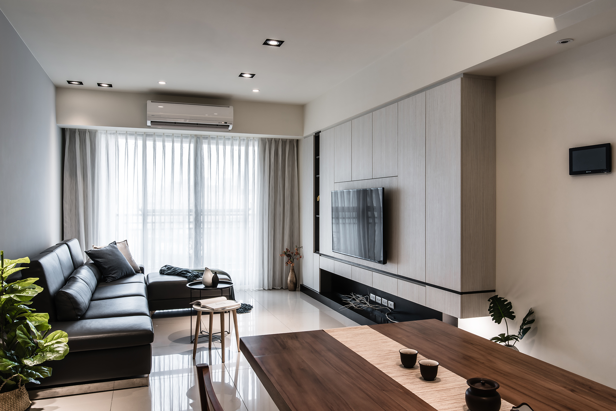 為達到屋主期望的生活風格,壓樑、樑柱大的格局現況,設計師巧妙透過格局、機能的整併,修飾風水及視覺感受。 公領域電視牆面,暗藏大量收納空間,透過適度的開放展示,增添櫃體造型變化,擁有大型儲物空間,又能維持空間簡鍊美感;