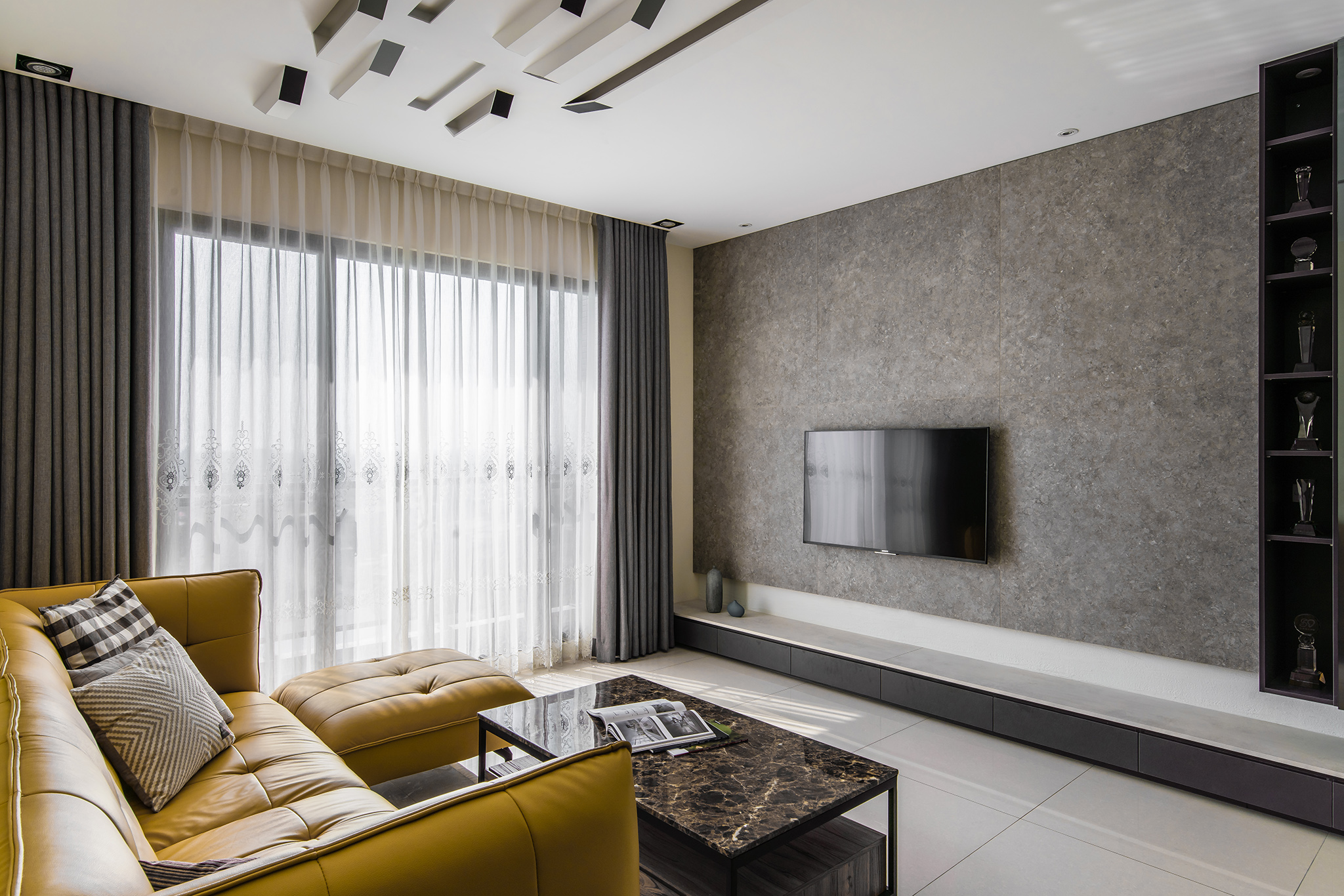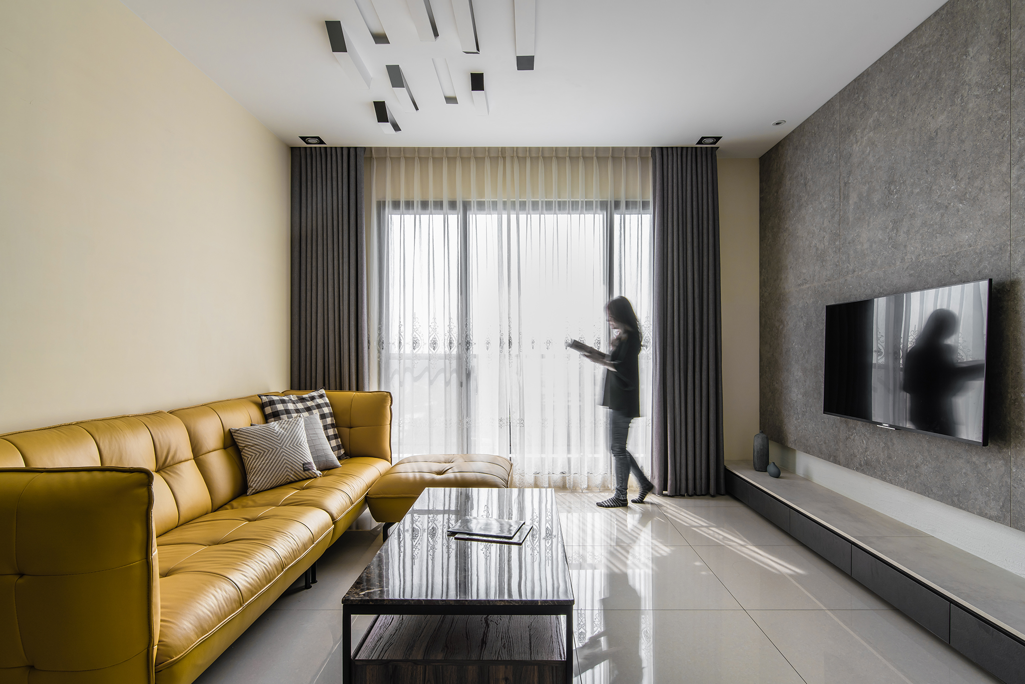 客廳磁磚主牆呼應80*80的拋光石英磚地板型塑出簡約大器的空間,符合家人放鬆聊天或是招待朋友的期待。粗壯的結構量樑柱崁入吊隱式冷氣,不犧牲樓高的狀態下搭配牆面與天花板的色彩處理,百合白的油漆延伸至雪白天花板,自然光照耀著雲朵意象的造型,把好天氣與好心情帶進室內裡。