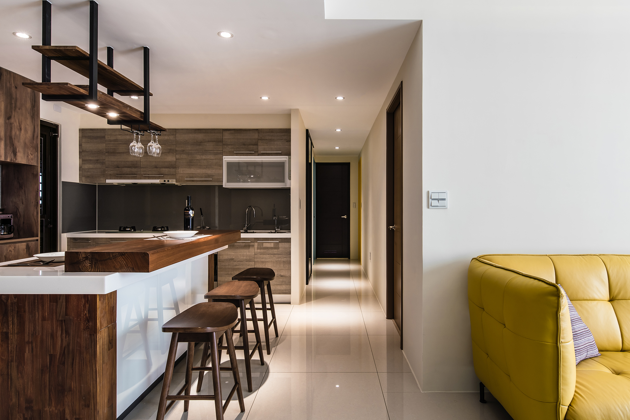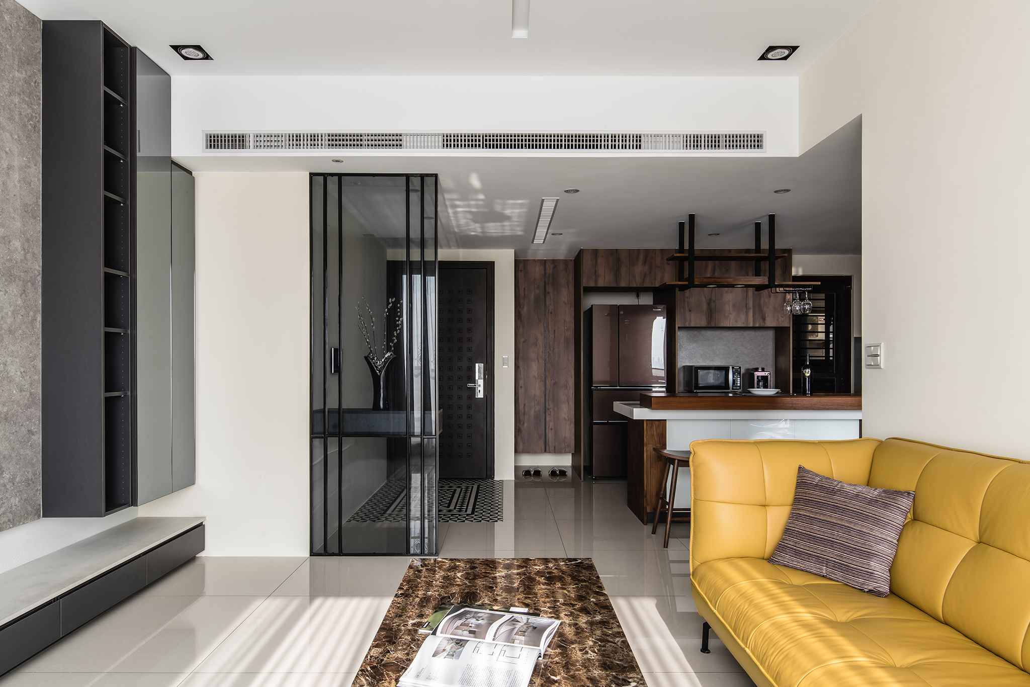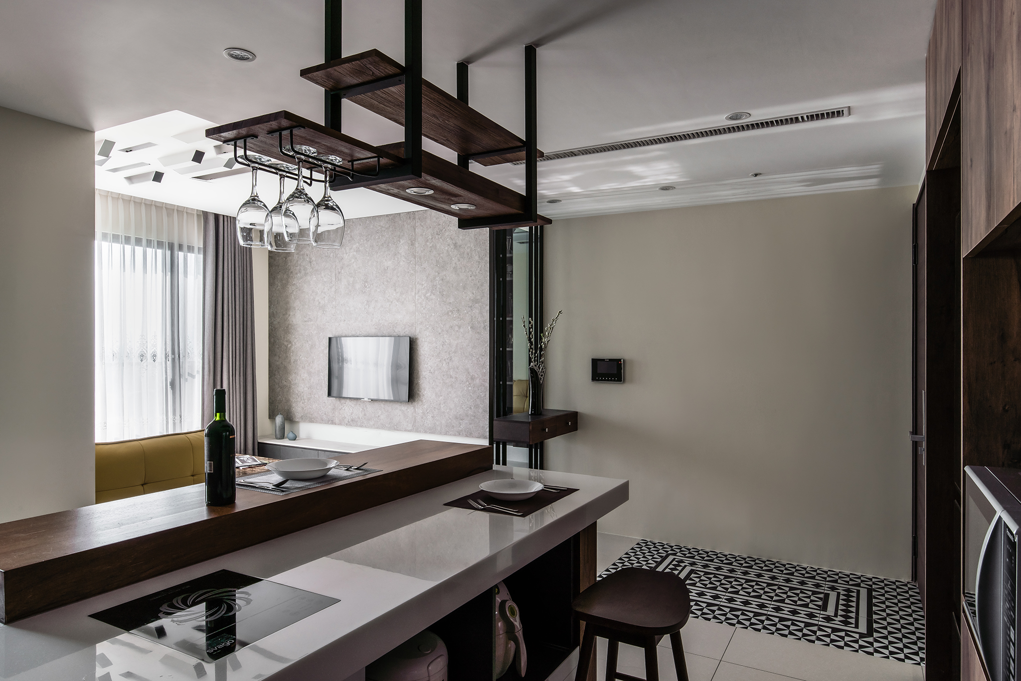 格局方正且採光良好的新成屋中,設計師打破制式的空間格局,在營造風格同時替屋主量身訂制貼合生活的使用機能。玄關處鋪設復古花磚界定落塵區與室內空間,一扇現代設計風格的半透明屏風化解了穿堂煞,讓客廳採光能做最有效的發揮。餐廚區域設計為居家核心,利用屋主喜愛的實木為主要素材進行規劃,將餐廚轉向並以高級緬甸柚木搭配烤漆玻璃打造中島吧台,傳統的餐廚空間成了別緻的休憩場所。