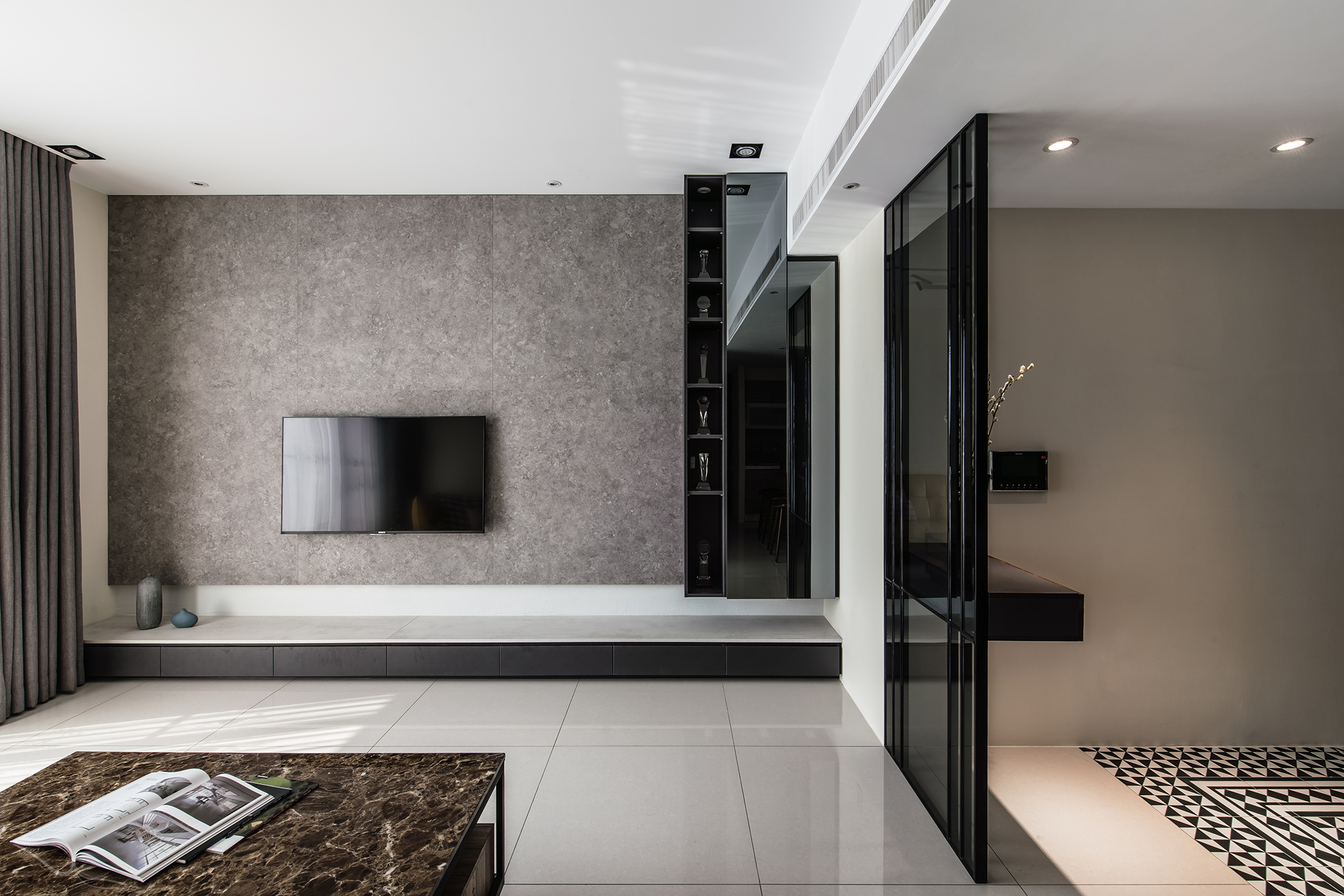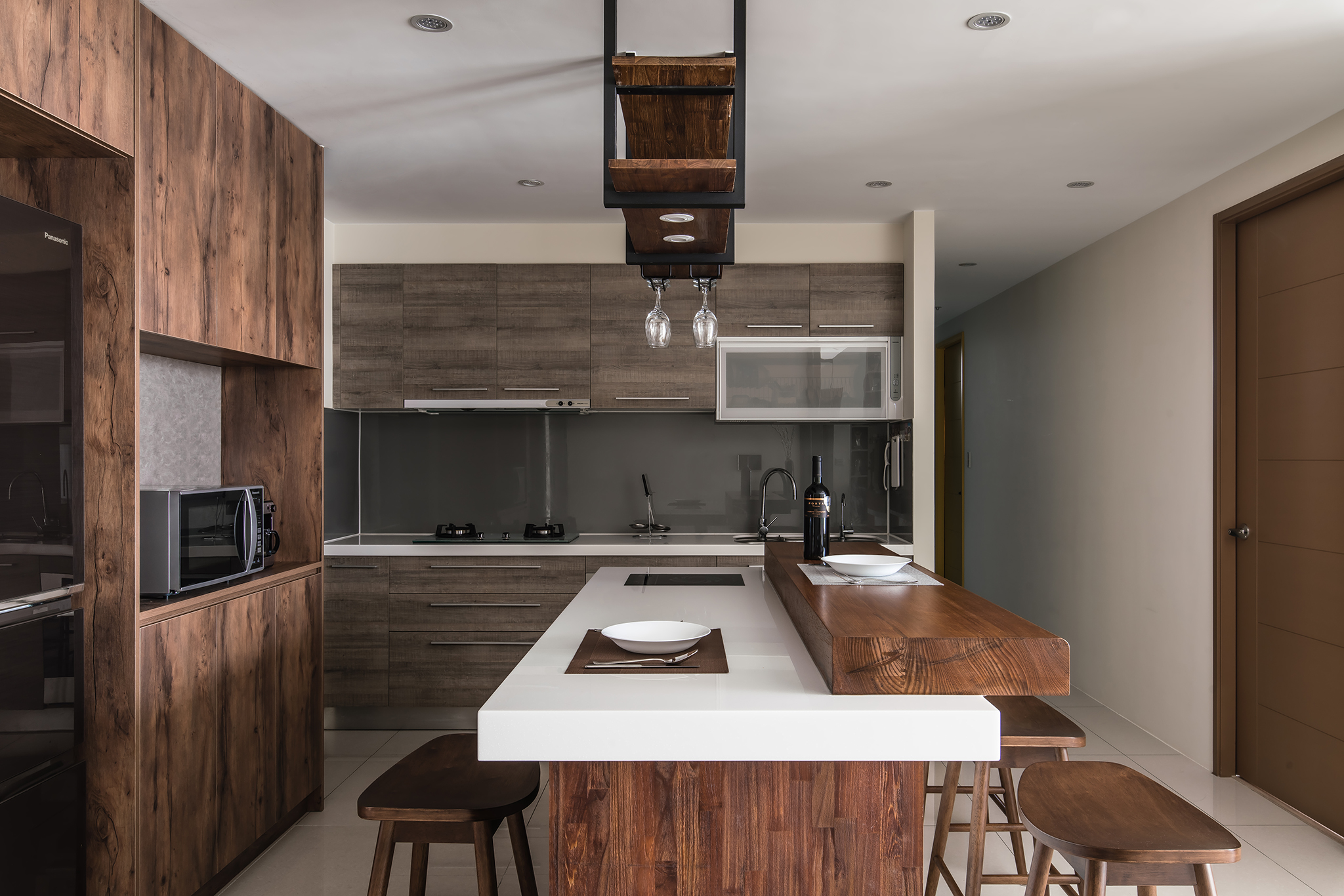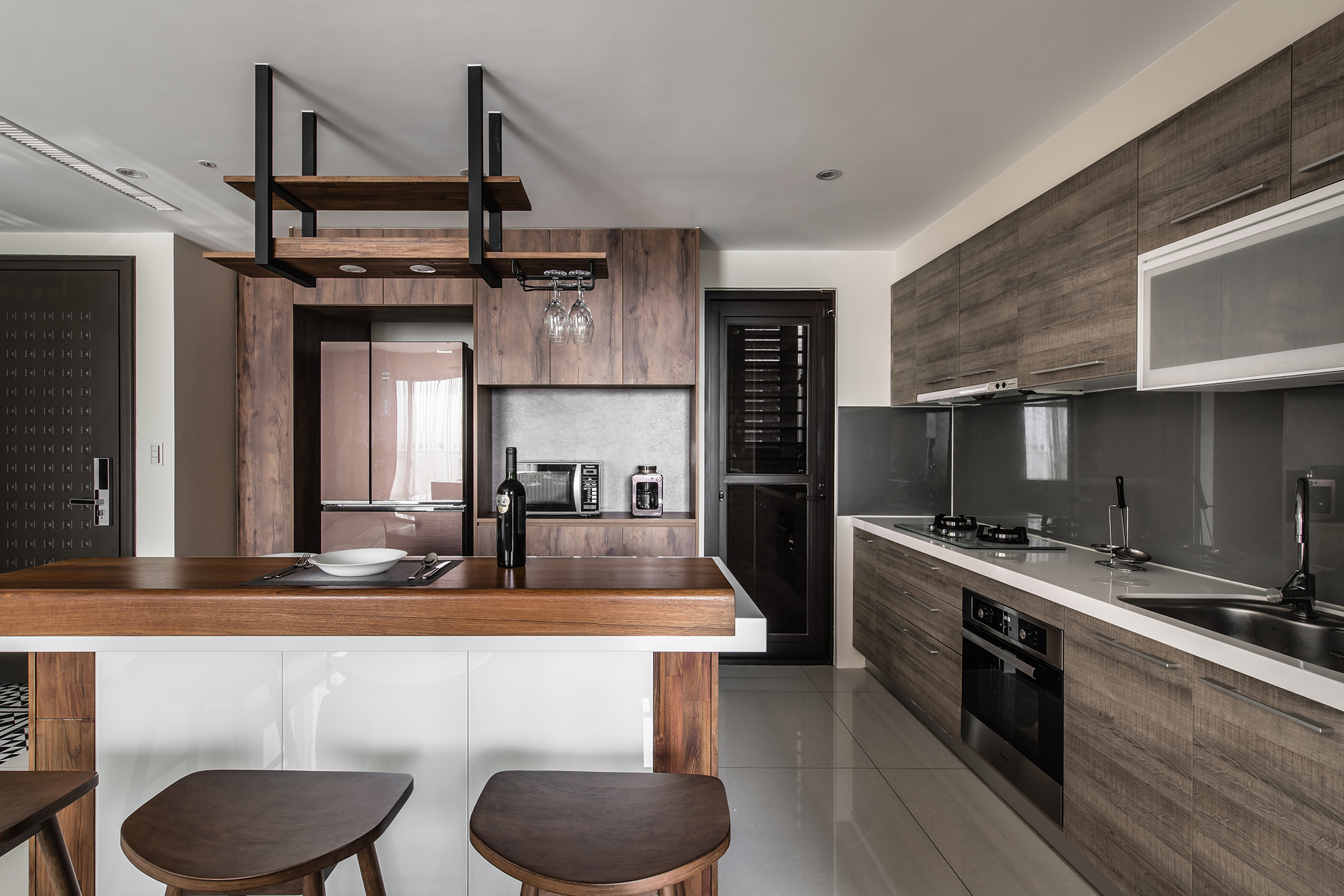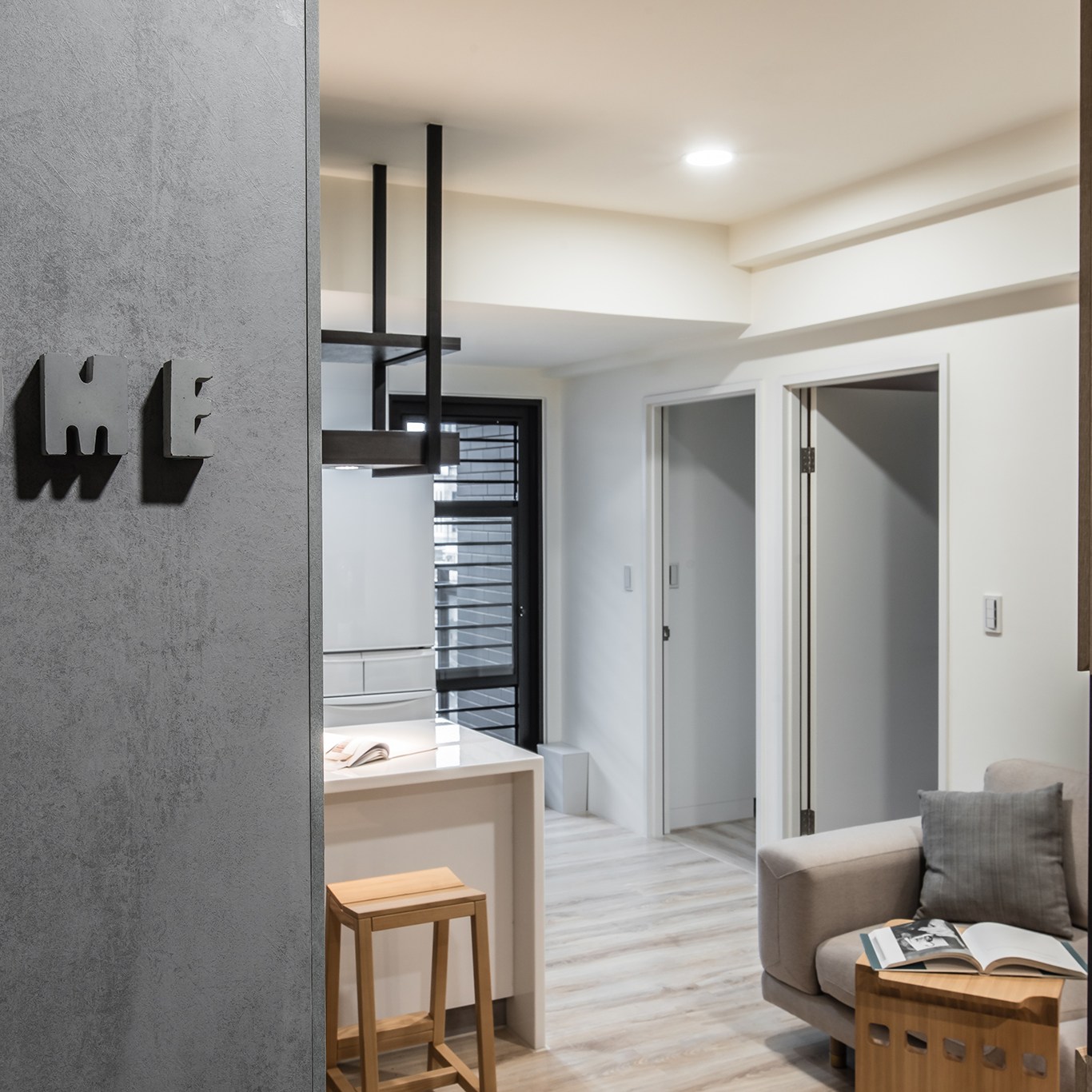 格局方正且採光良好的新成屋中,設計師打破制式的空間格局,在營造風格同時替屋主量身訂制貼合生活的使用機能。玄關處鋪設復古花磚界定落塵區與室內空間,一扇現代設計風格的半透明屏風化解了穿堂煞,讓客廳採光能做最有效的發揮。餐廚區域設計為居家核心,利用屋主喜愛的實木為主要素材進行規劃,將餐廚轉向並以高級緬甸柚木搭配烤漆玻璃打造中島吧台,傳統的餐廚空間成了別緻的休憩場所。