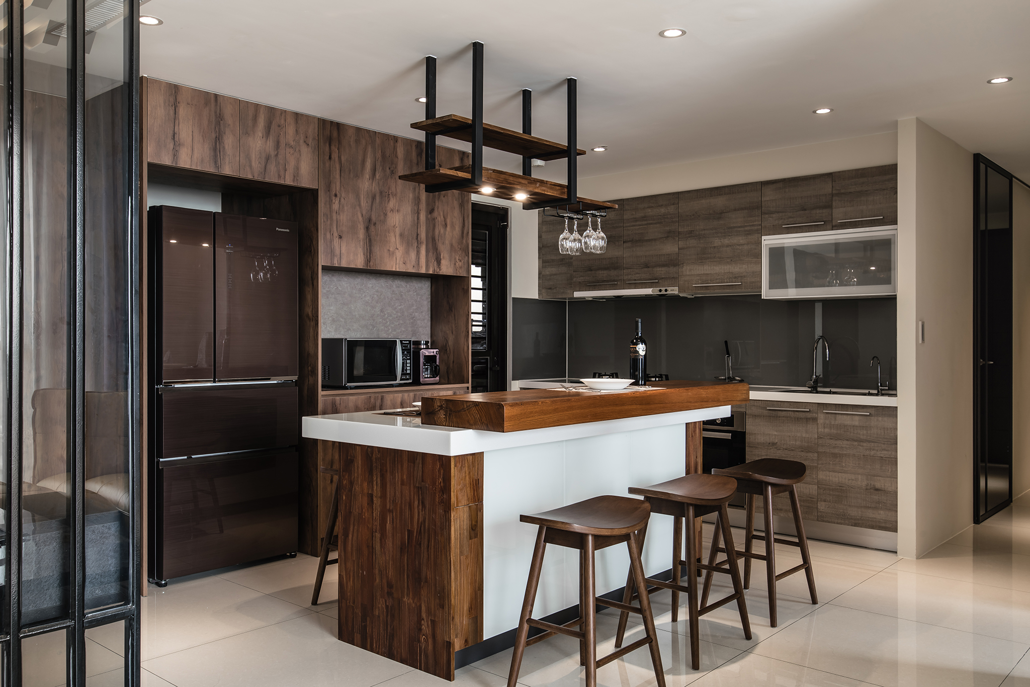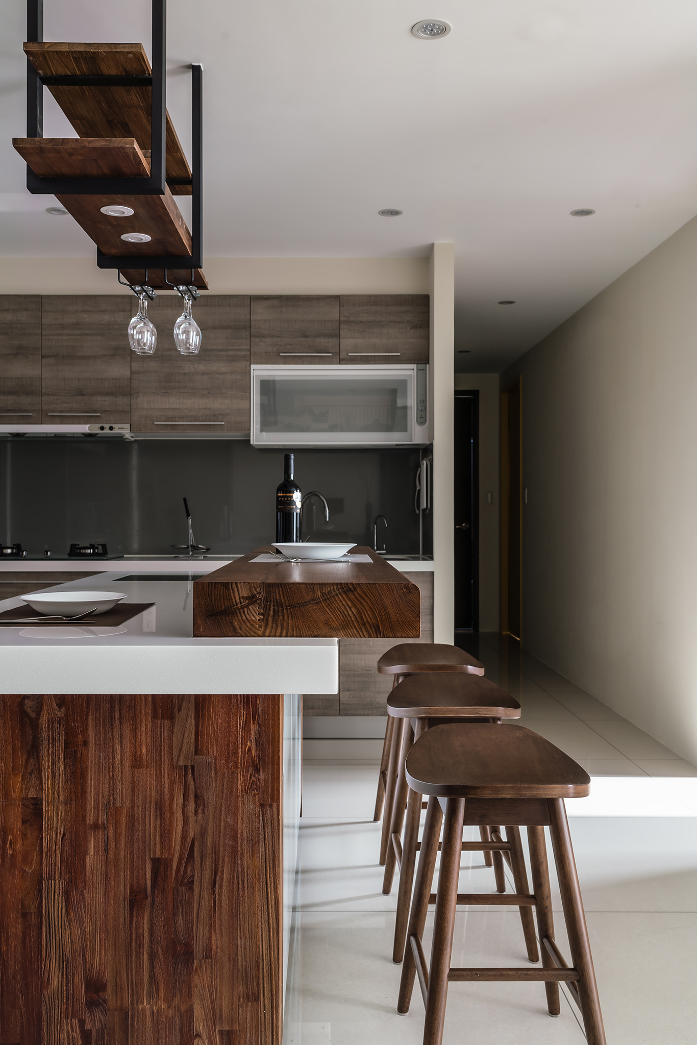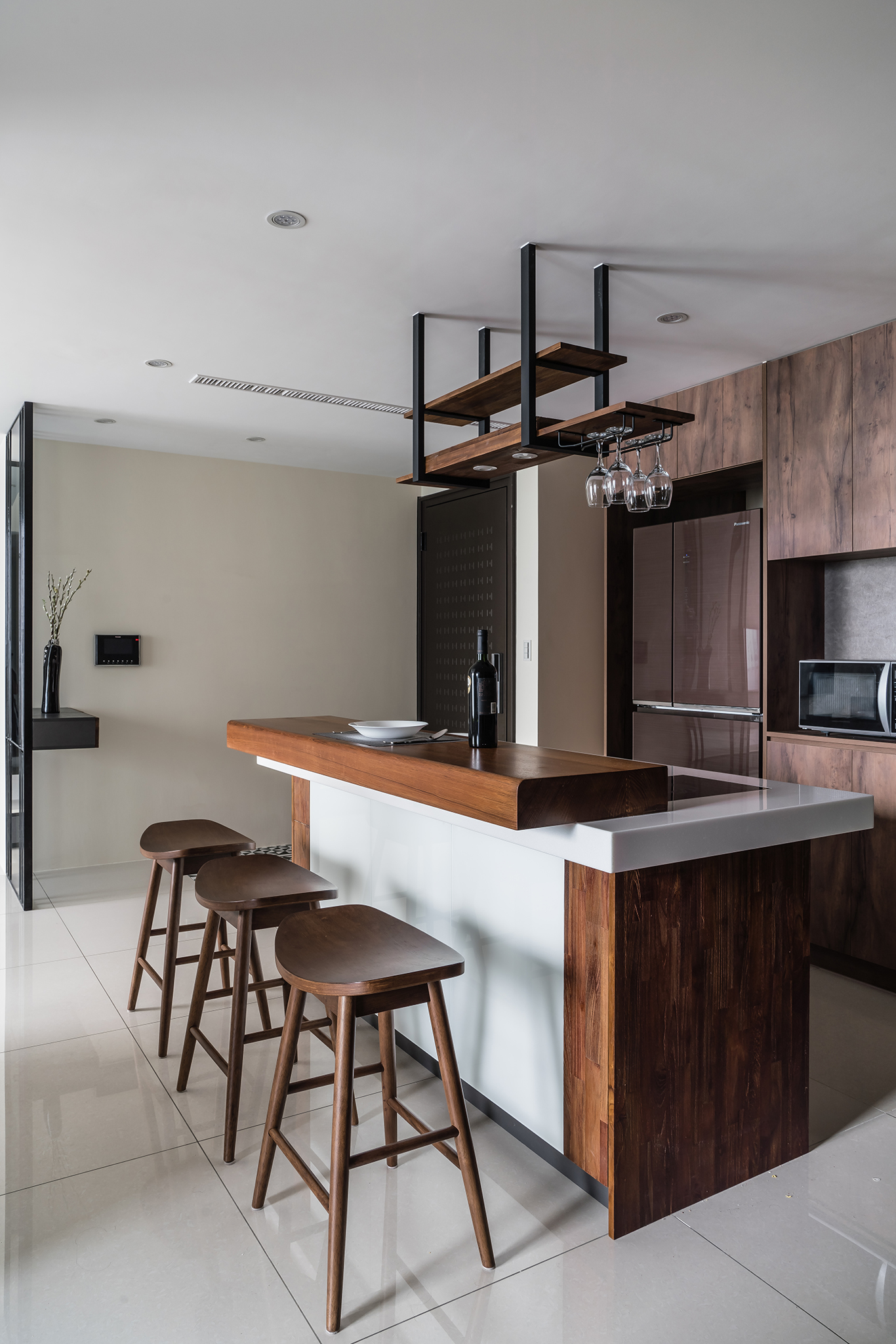 經調整後的中島吧台面向客廳大面落地窗,早上沐浴著陽光打杯果昔補充活力,下午看著河畔美景享受午茶時光,夜晚面對窗外襯著室內氣氛光,滿足小酌一番的慾望。