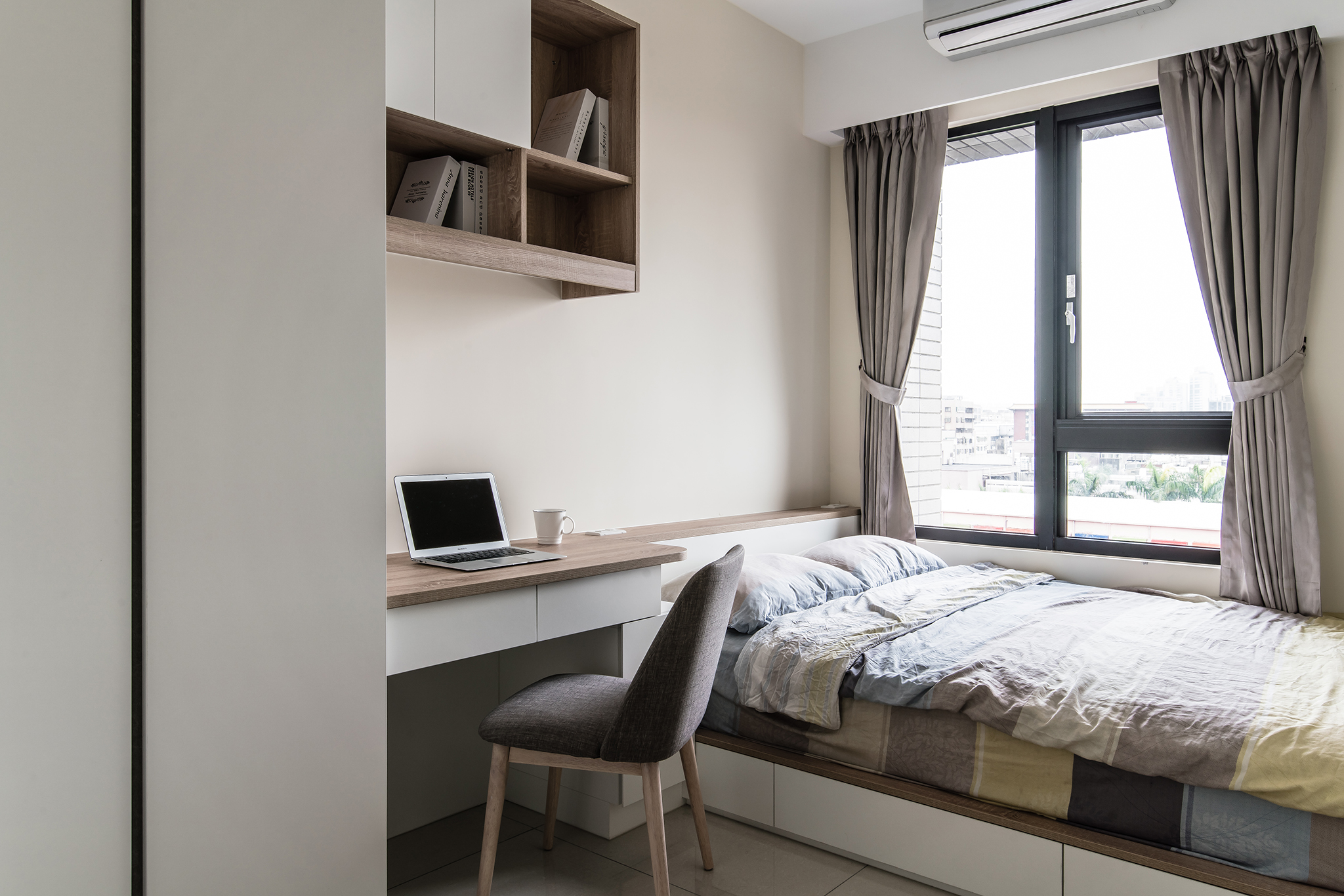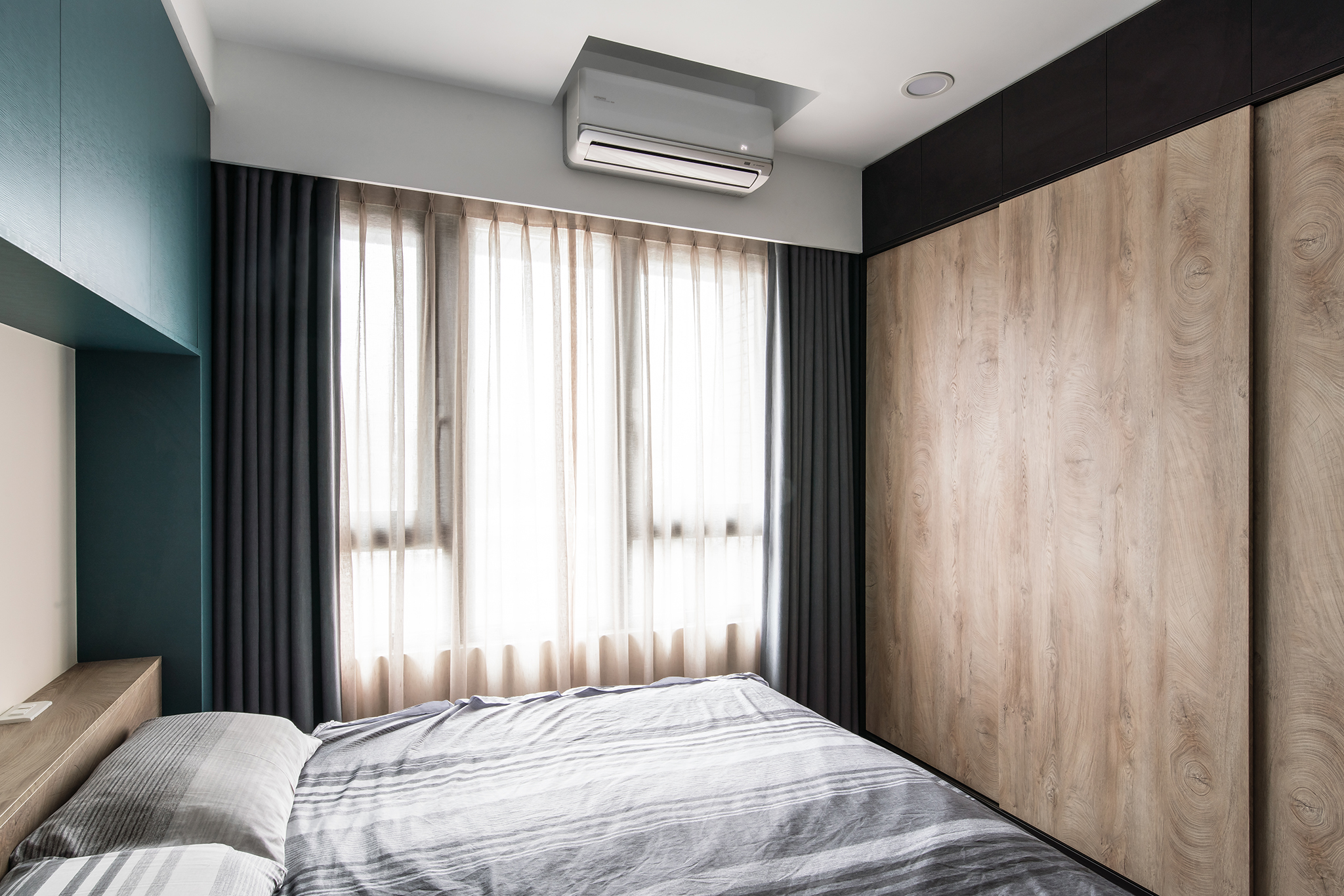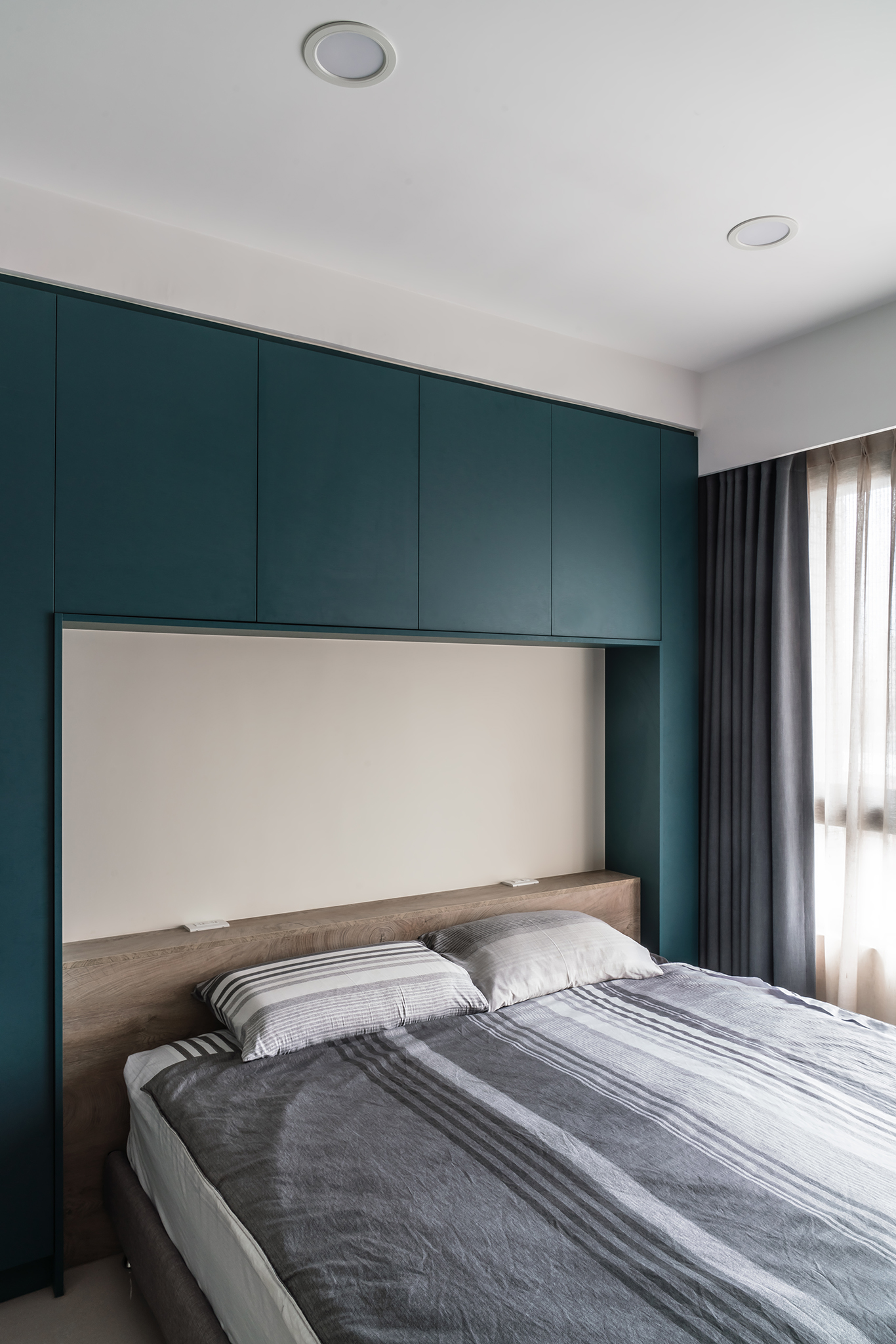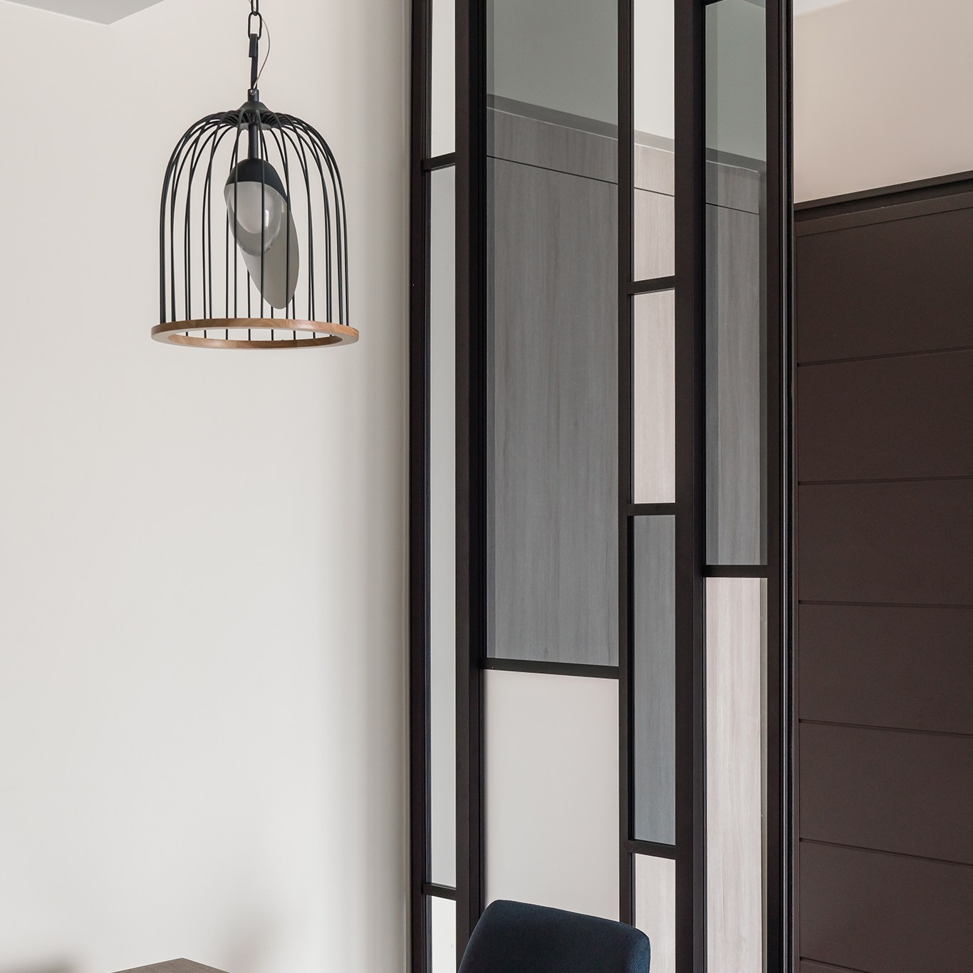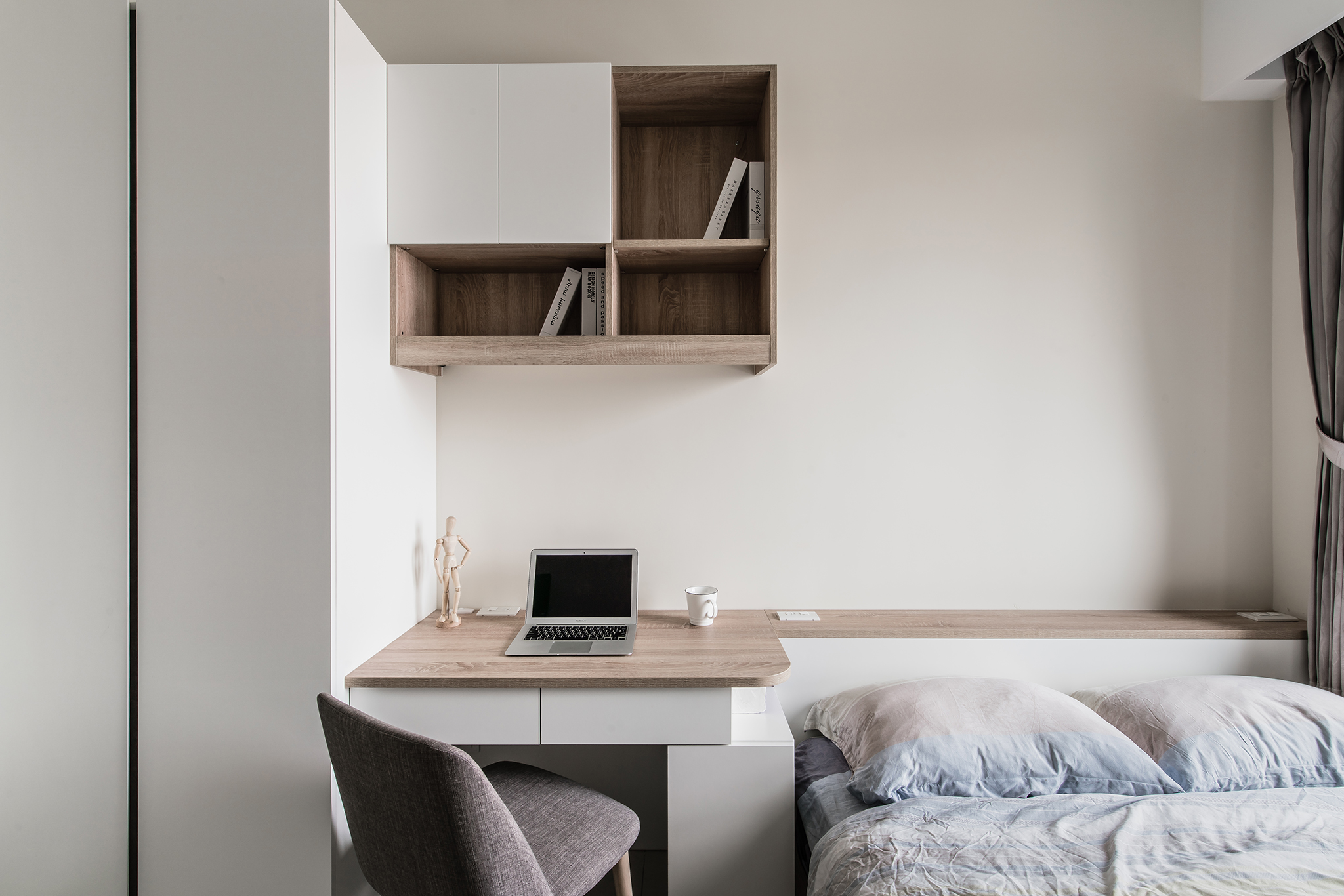 電視主牆利用深淺色塊堆砌出立體造型,構成廳區的矚目焦點,餐廳天花則懸掛鐵件鳥籠吊燈,形成餐桌上方的視覺亮點;臥房考量到床頭壓樑,利用其深度結合櫃體,並以綠色做跳色處理,結合實用性與美觀度,而以溫潤木質板材打造的大容量衣櫃,則將清新淡雅挹注於室。