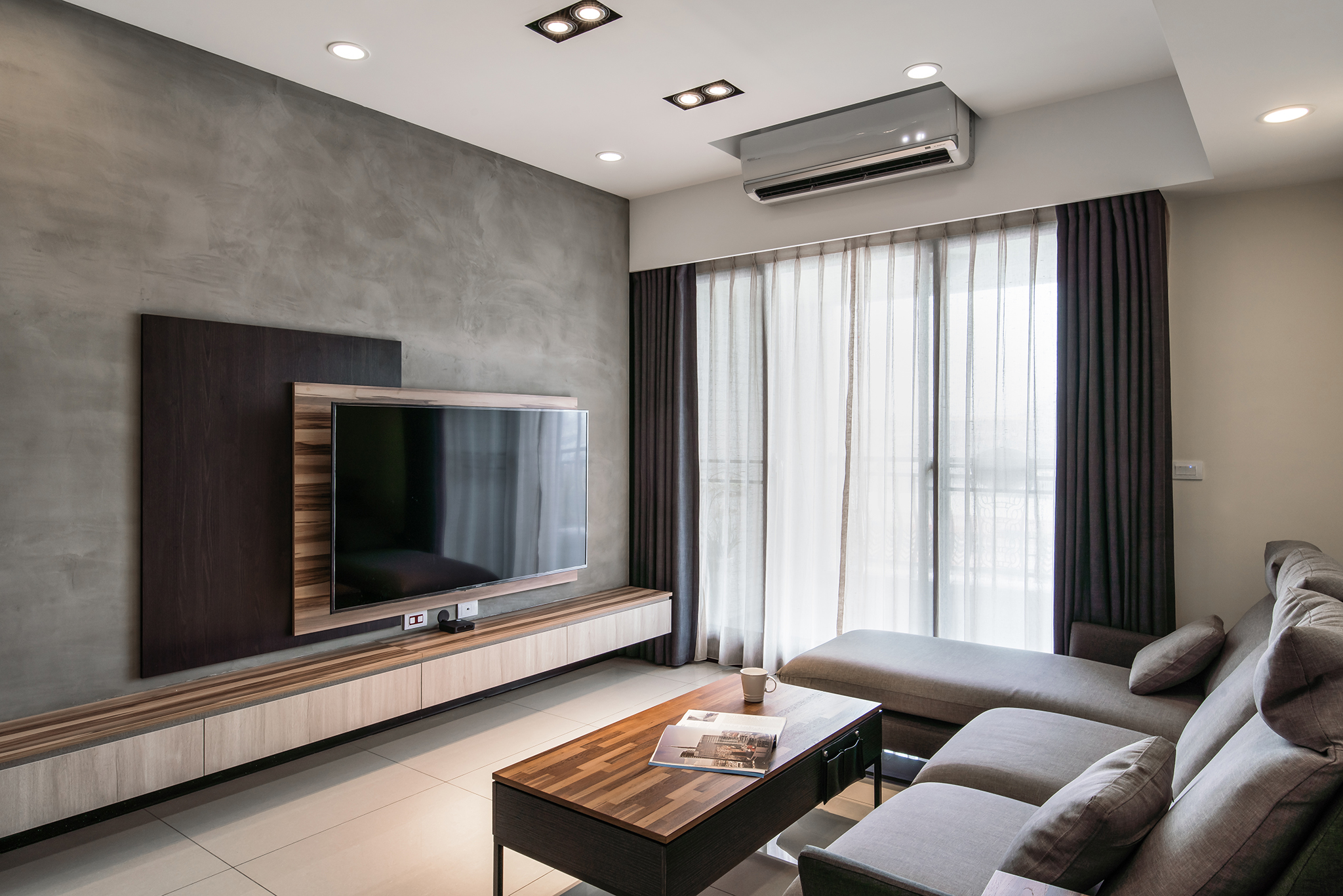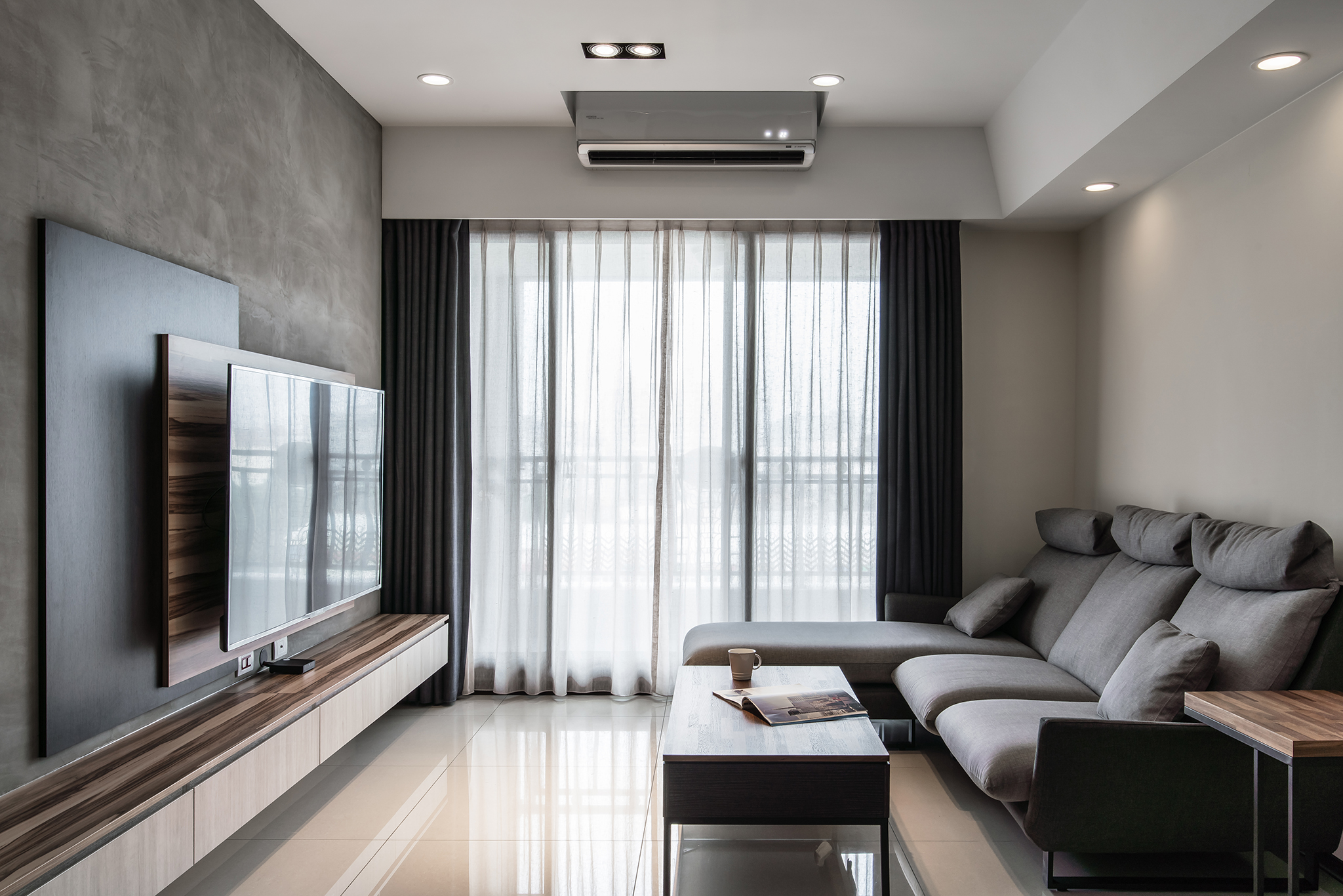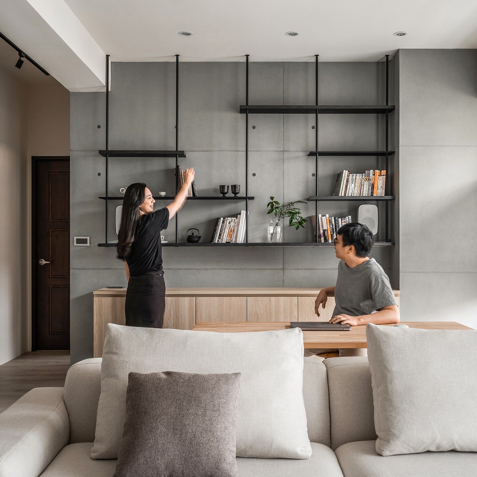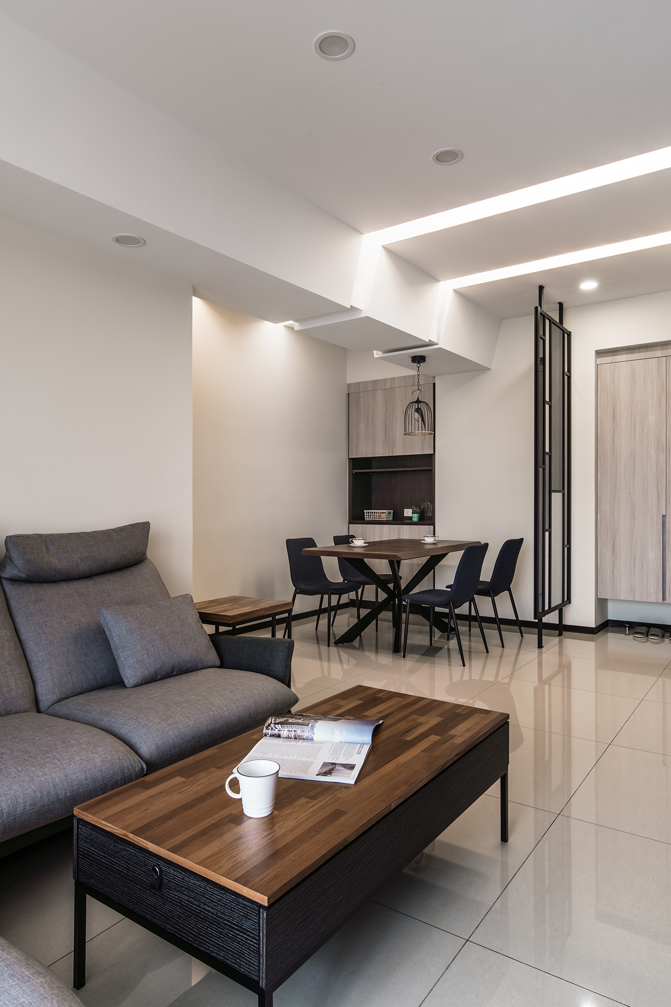 本案為37坪居家空間,屋主為年輕夫妻,喜好簡單有個性的裝修風格,於是設計師依循其生活習慣、量身打造空間機能,並解決橫跨餐廳、客廳之間的大樑壓迫問題,透過造型包覆與燈光加以修飾,藉由優雅內斂的灰白定調整體,為空間注入人文氣息。
