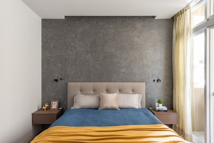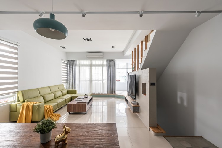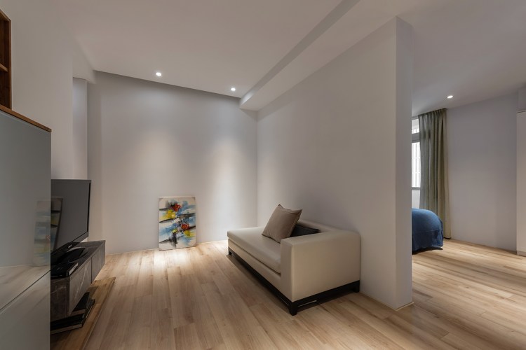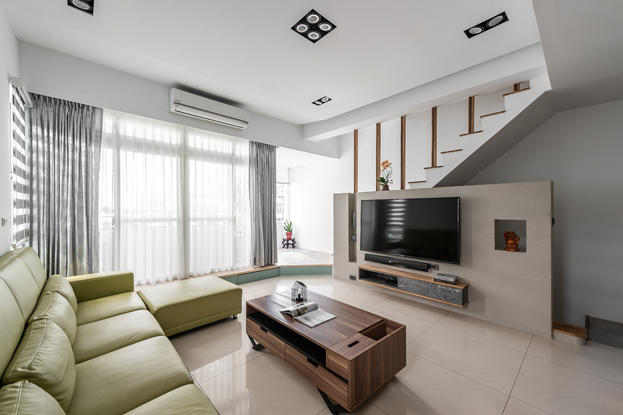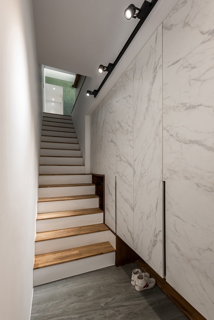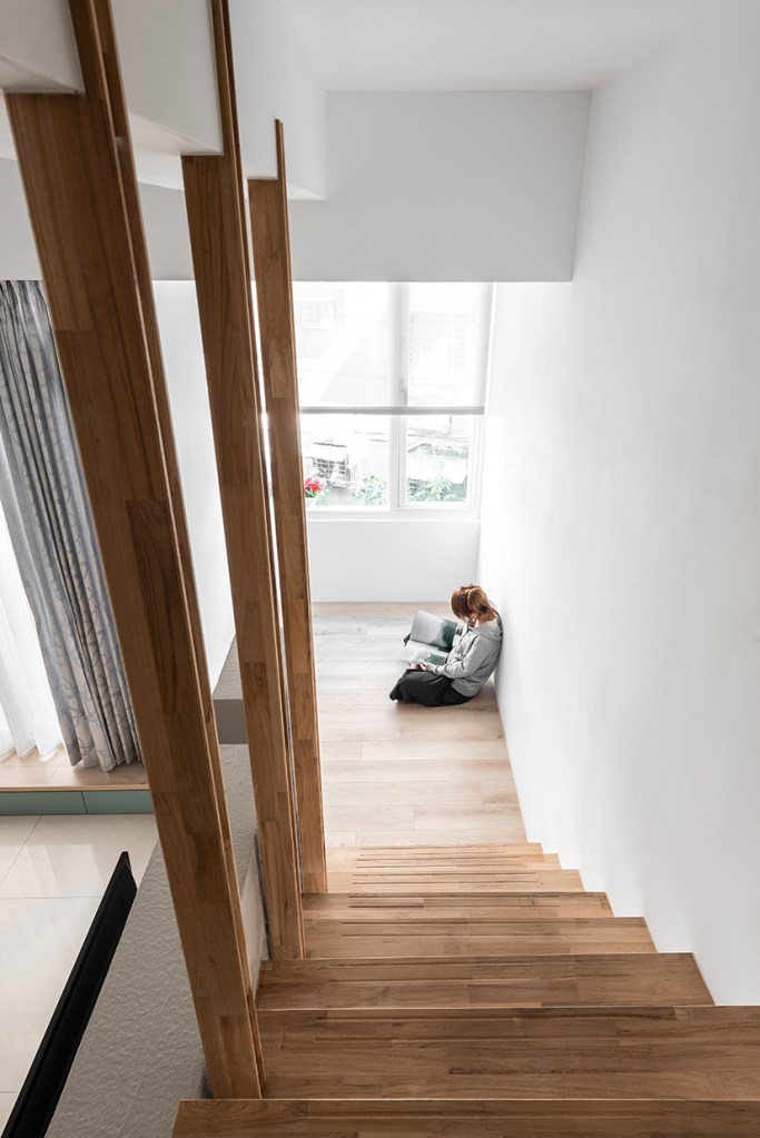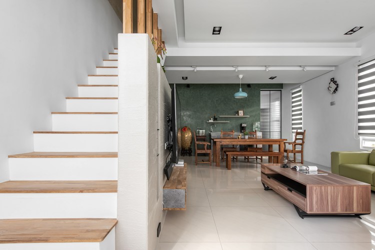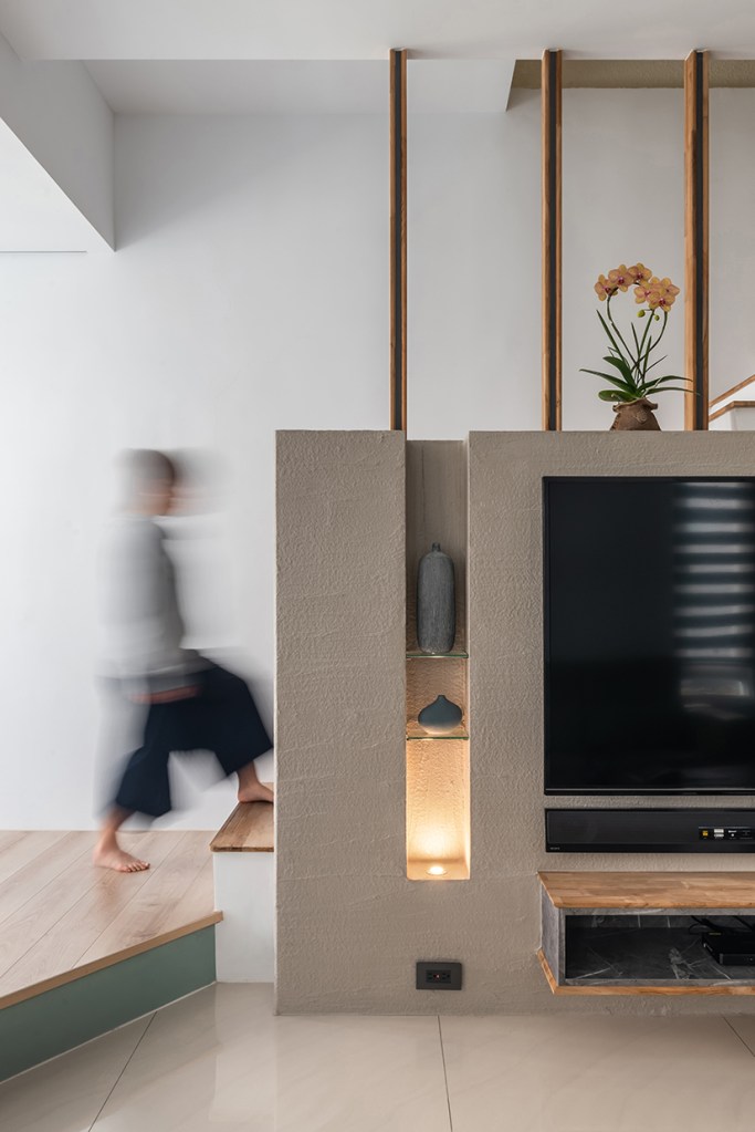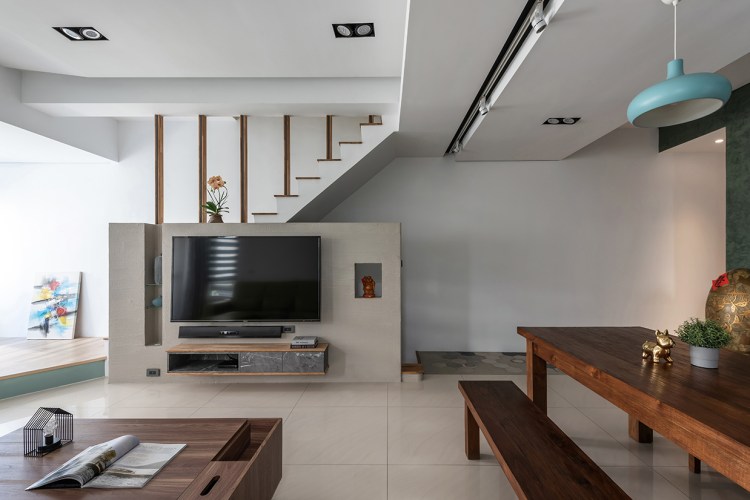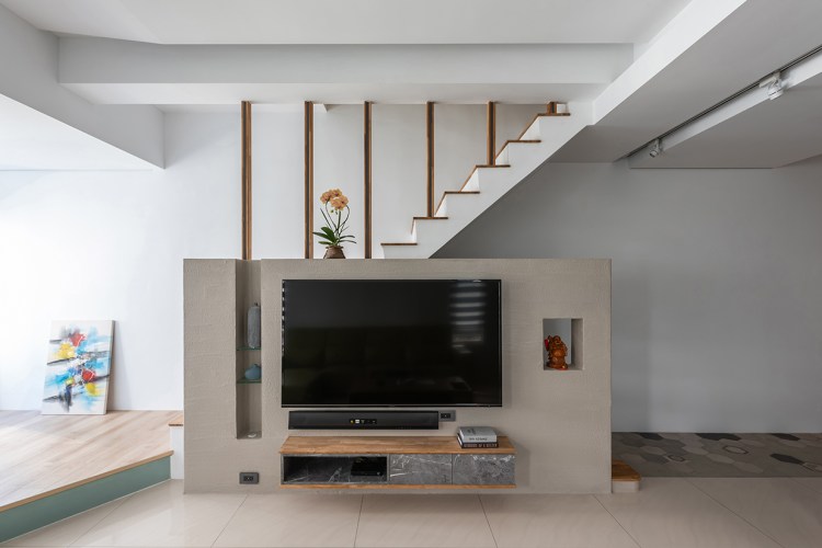 半高的電視牆珪藻土呈現的自然抹痕,與純白空間形成對比,並結合樓梯、扶手與天花板,形成文藝的空間氛圍。