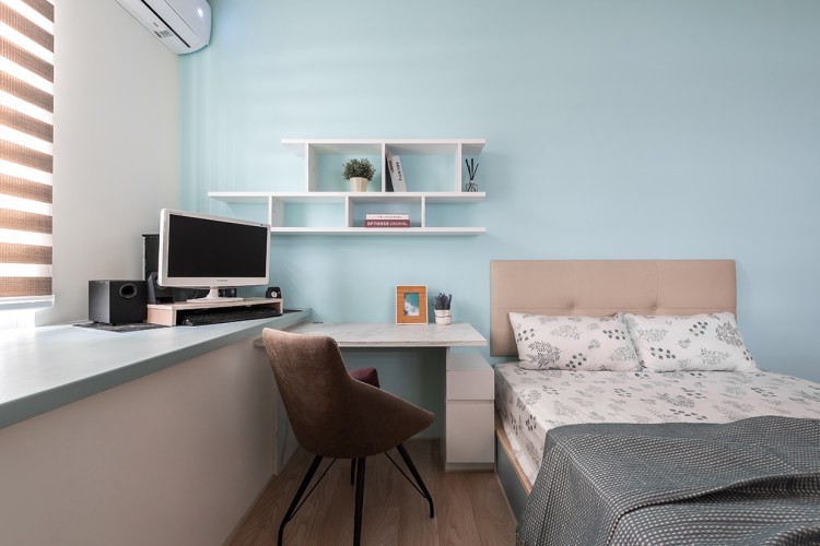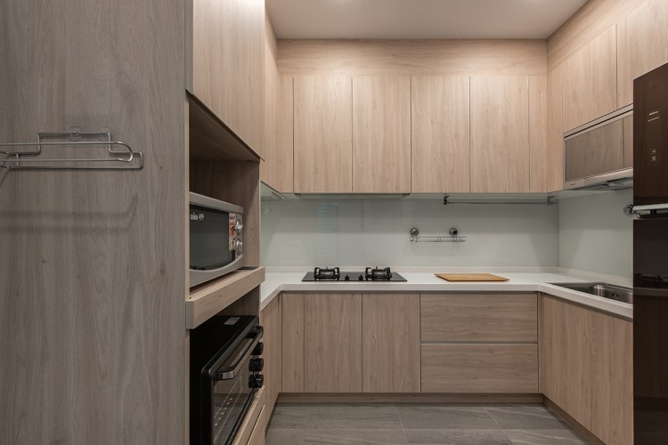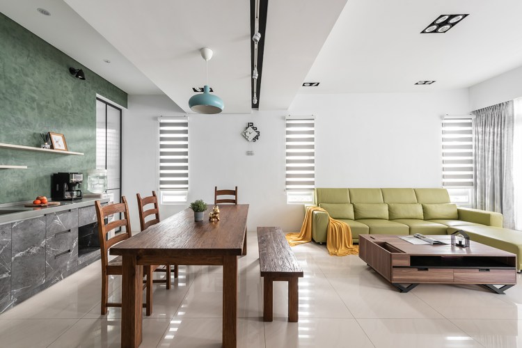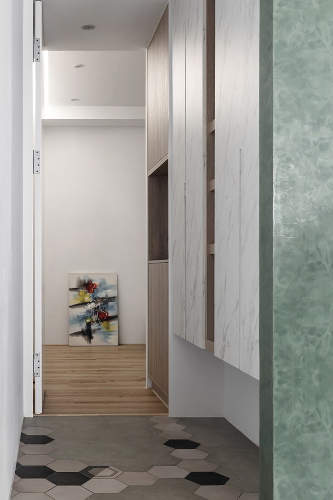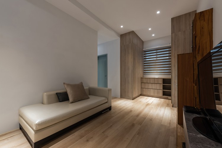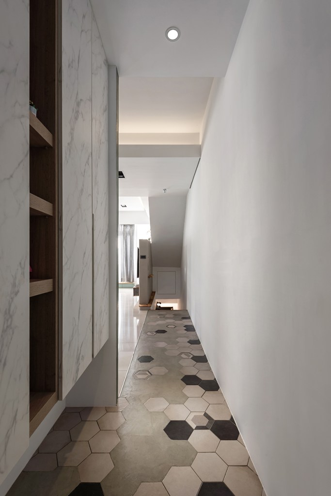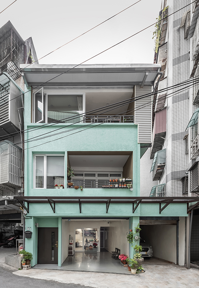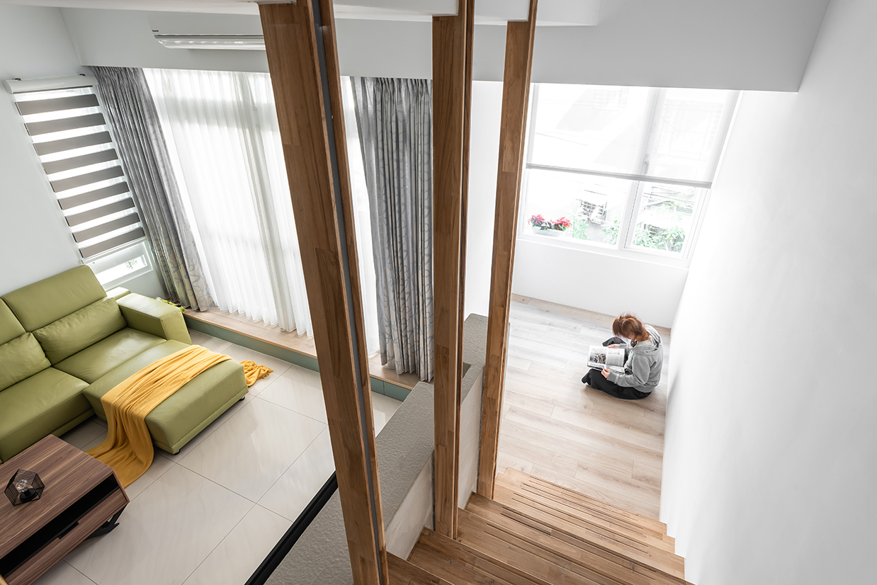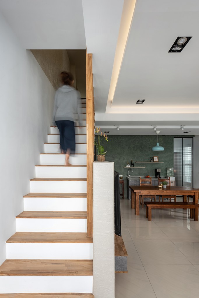 設計師與屋主經過討論之後,一樓將大門入口改位,並整理一樓換鞋區及設置大片的鞋櫃,容納一家五口近200雙鞋,同時也兼顧女主人的美髮店生意使用及家中的停車。 旋上2樓,因為男主人非常喜愛唱歌,也時常找朋友一起練唱,而女屋主也有一手好手藝,所以格局上將公共區域的客廳及餐廳面積放大,並於餐廳旁配有輕食吧檯,方便招待朋友。主臥室本來收納不佳,堤朵那設計將機能分區為起居室、更衣室、臥室、小陽台等,完整收納也讓睡眠區品質更安穩,彼此較不會互相影響。三樓則為神明廳、客房及三間小孩房,原有的鐵皮屋頂漏水又悶熱,在做了隔熱天花與全棟的隔音氣密窗,成為安靜純白的靜謐空間。