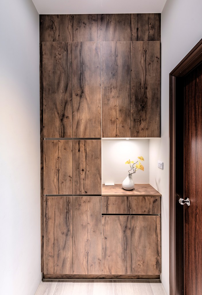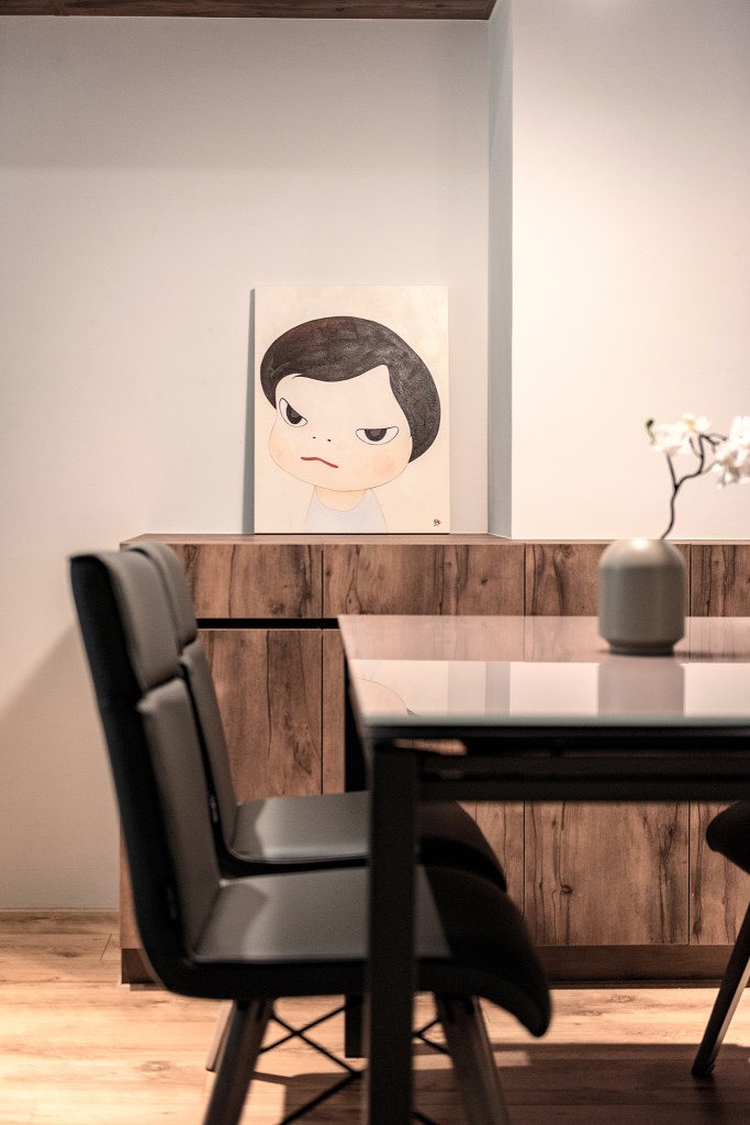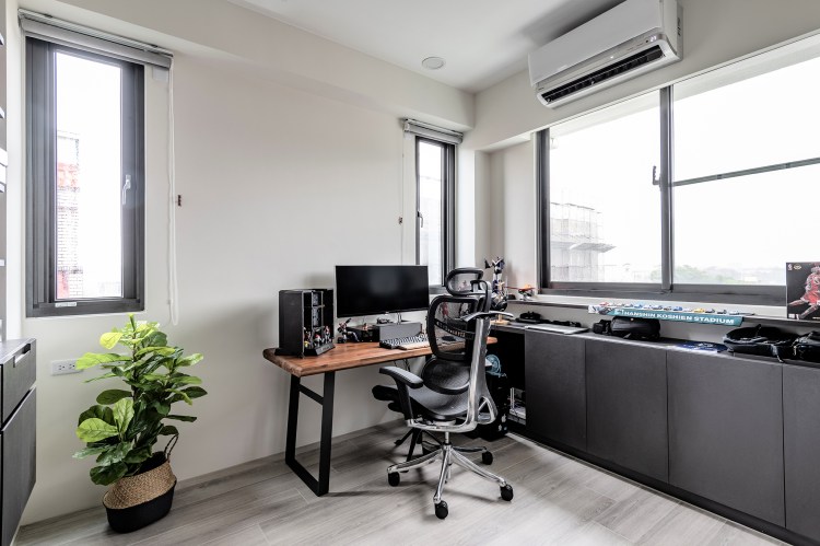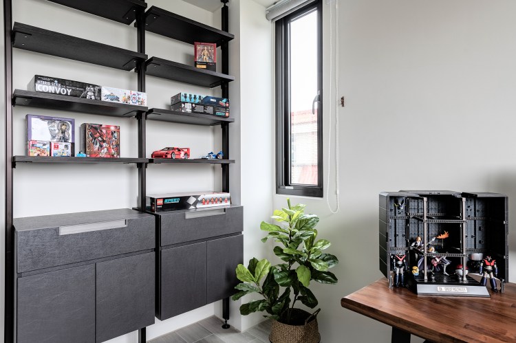 另外,依據男主人收藏玩具的嗜好,設計師幫他規劃了一間展示室,鋁合金五金櫃與實木桌板的配合,表現男屋主粗獷又帶有童心的性格。