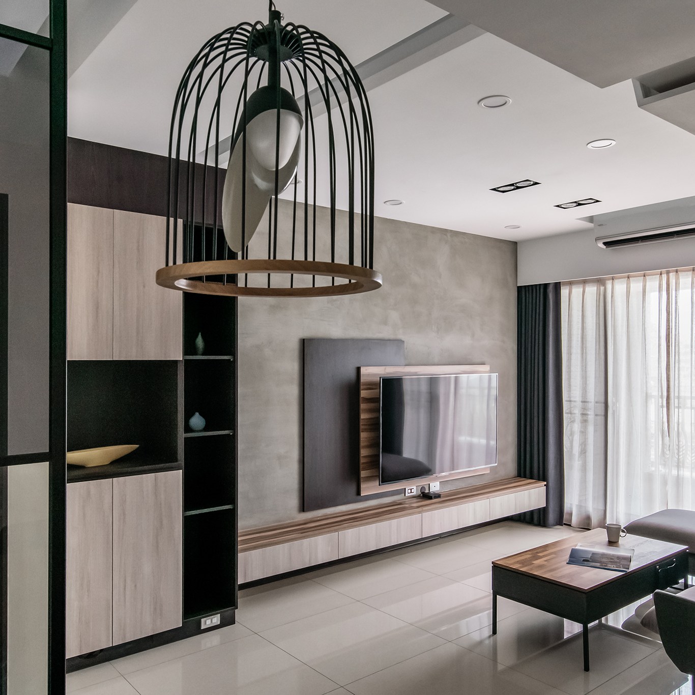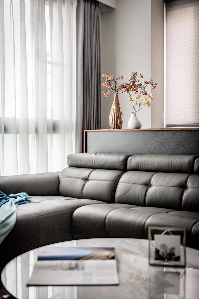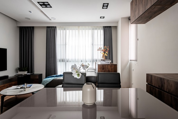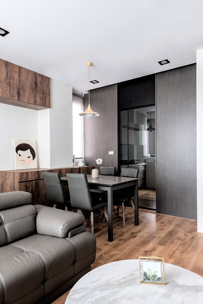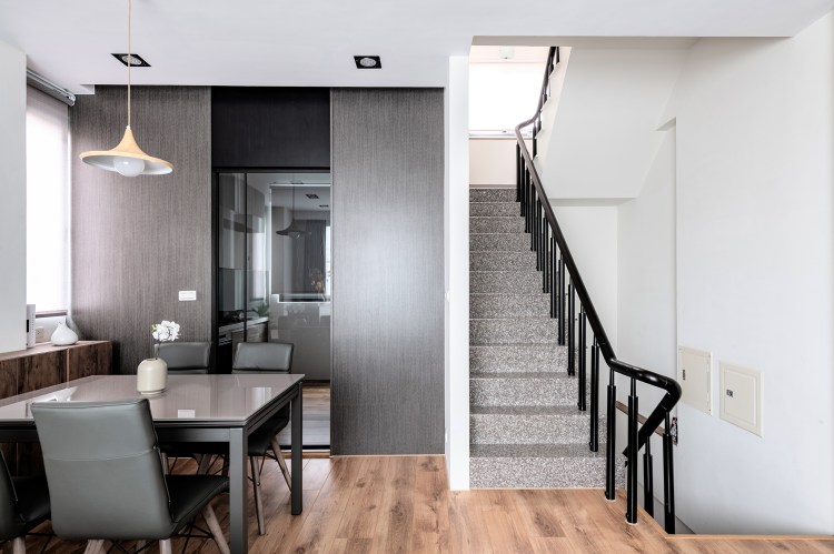 由於單層面積較小,因此公共空間的安排變得相當棘手,設計師為了讓家人不要受限於區域的分隔,能夠團聚在一處,所以將客廳、餐廳及書房的機能整合,使每個人能夠融洽地共用空間,又可以保有自己的角落,維持彼此之間的距離美感。