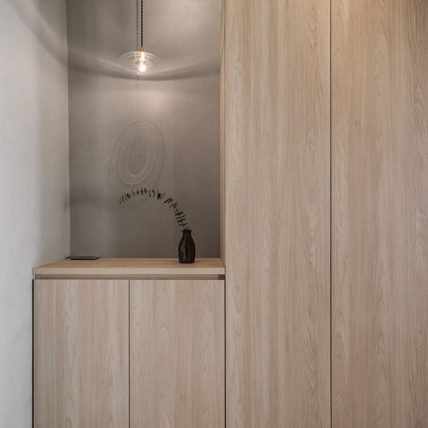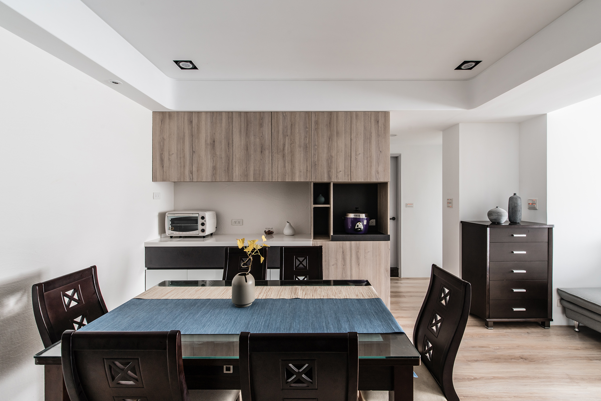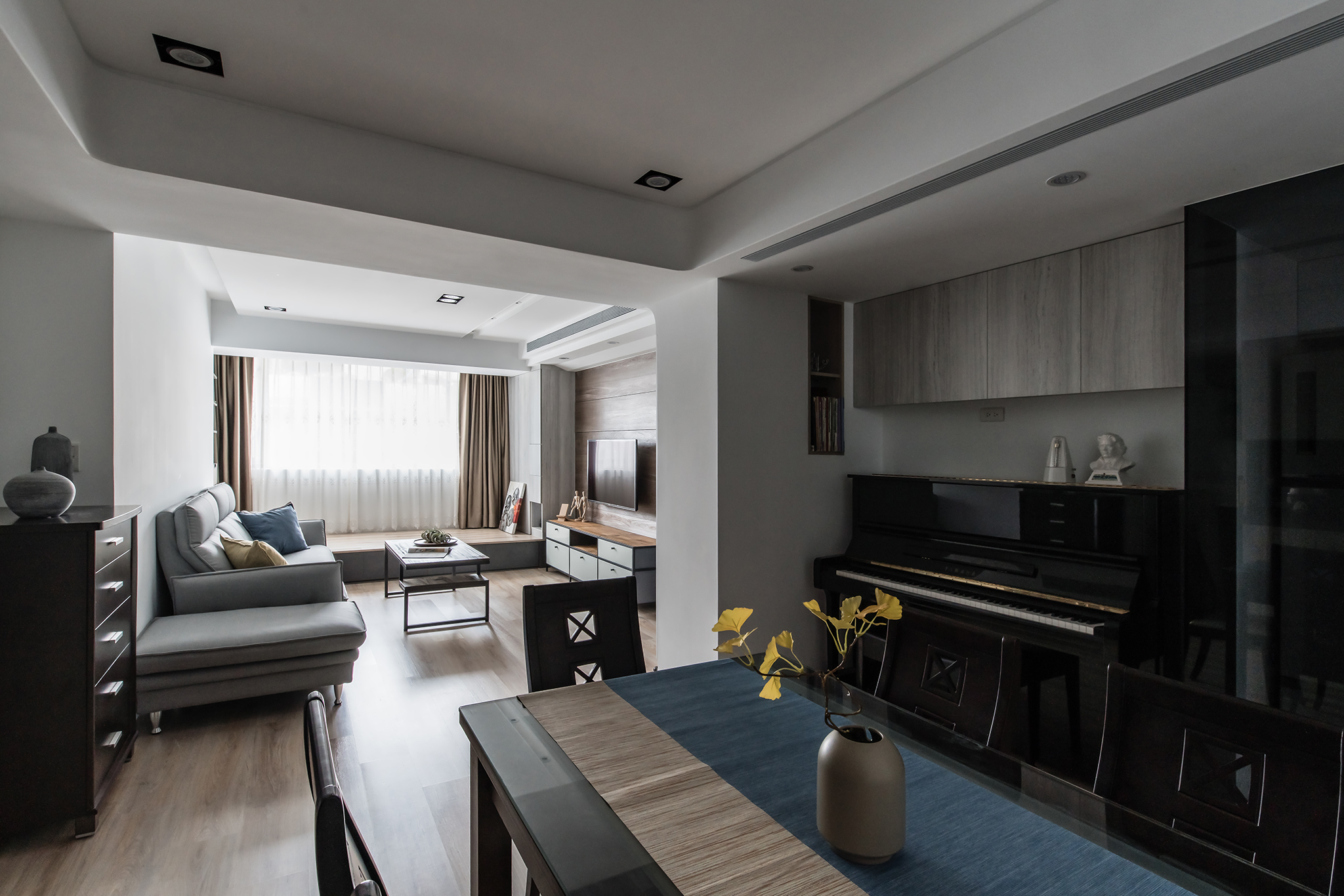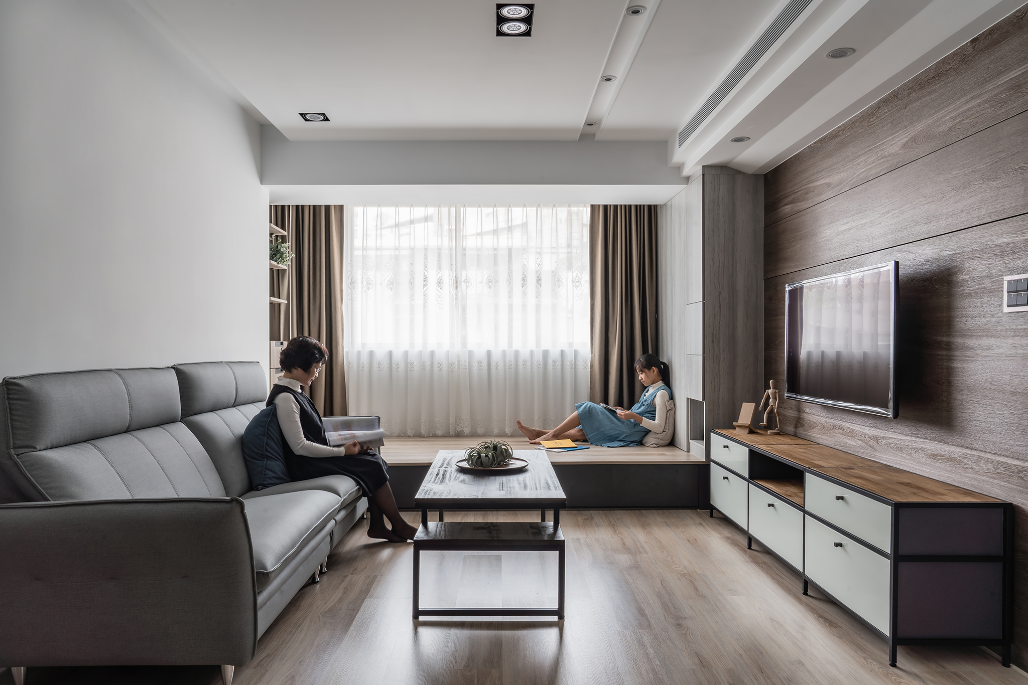 從生活需求規劃格局,將原格局 2 房變更至 3 房空間,釋放了一些公領域後,設計師選擇以開放式設計公共空間,並安排不同角落,讓每個成員擁有自己的舒適角落,藉此凝聚家人情感與互動。客廳區,將緊臨窗邊地坪架高,創造獨立感日光臥榻、書房休憩室,並在靠窗角落打造獨立高櫃、開放設計收納架,為公領域擴增收納機能同時不忘豐富視覺層次。