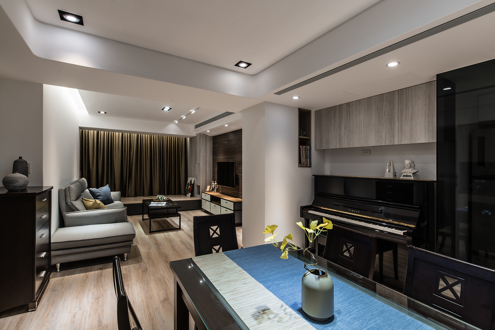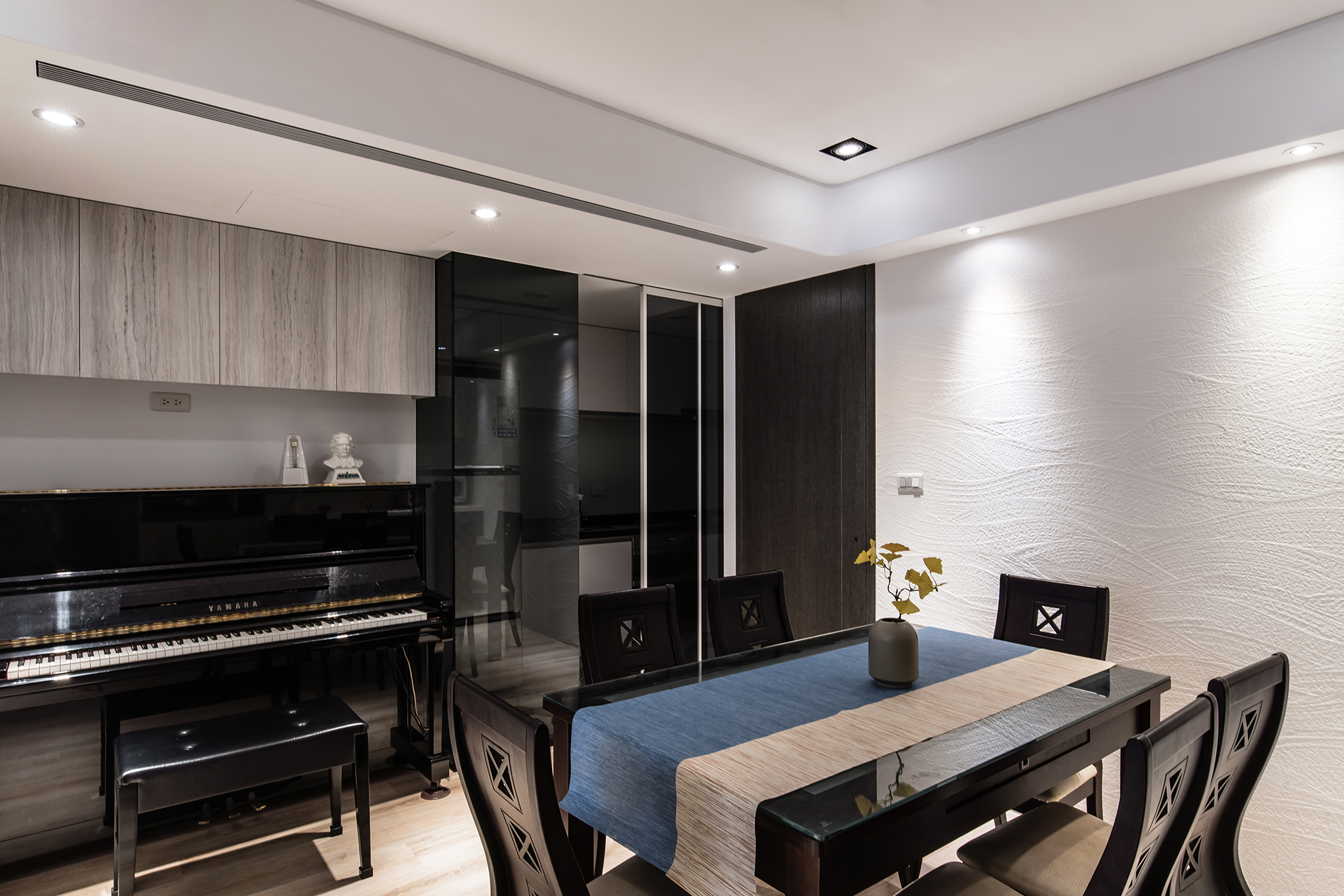 小小的餐廳區,同時容納用餐及鋼琴練習區機能,而從鋼琴練習區、廚房拉門、餐桌的深色系相互搭配,打造出一氣呵成的沉穩氣息。