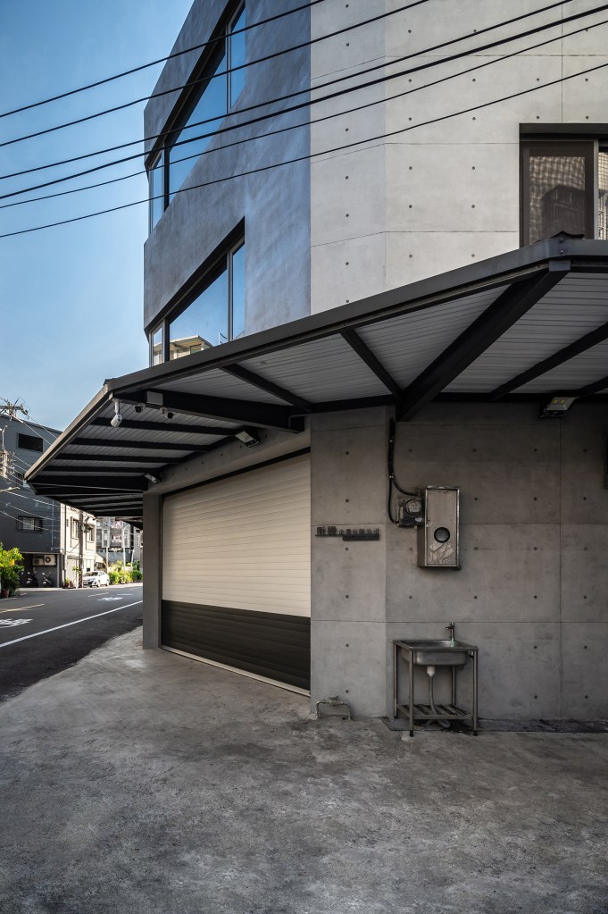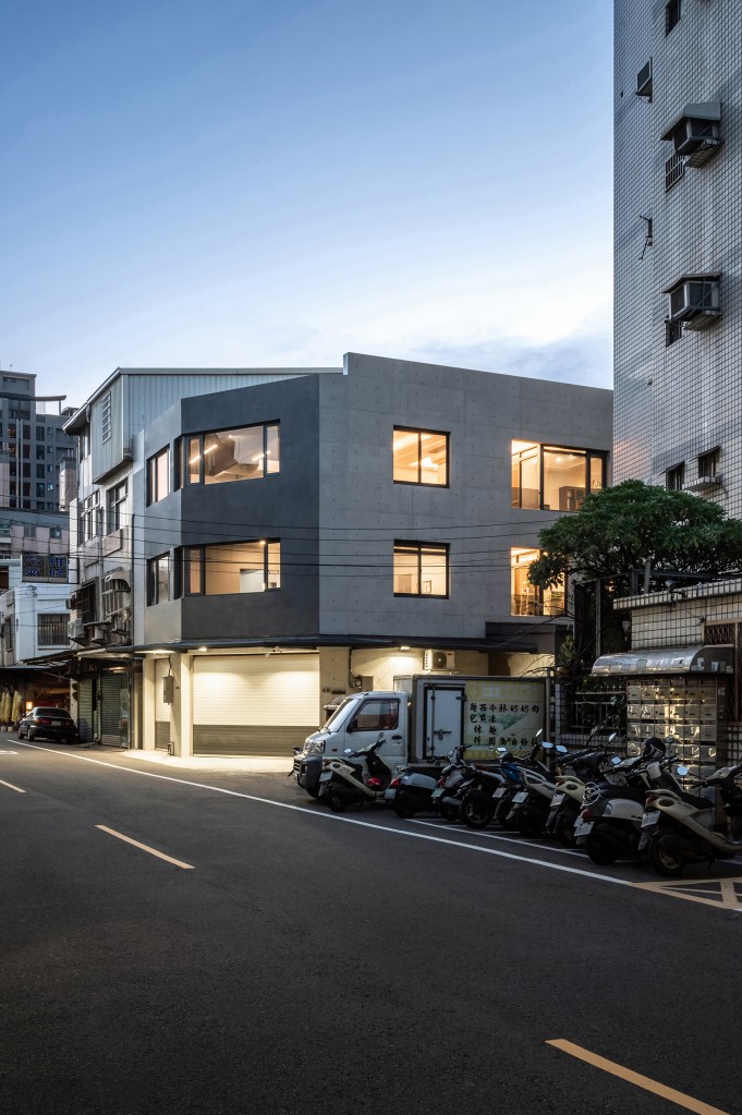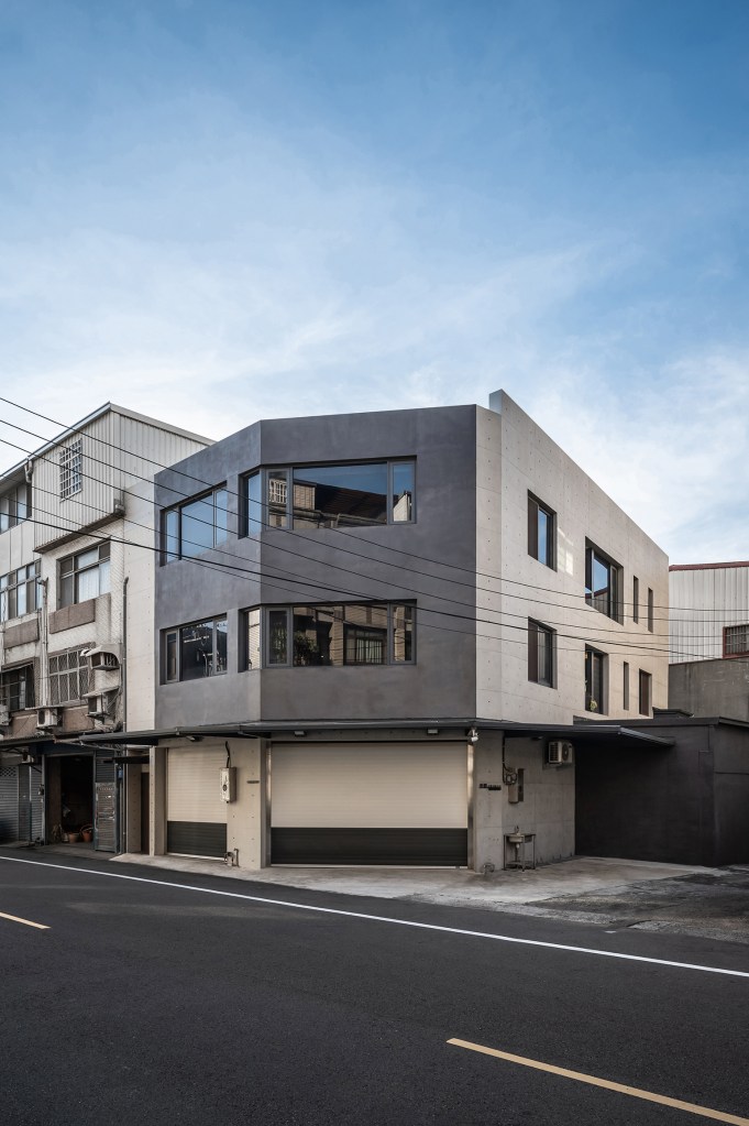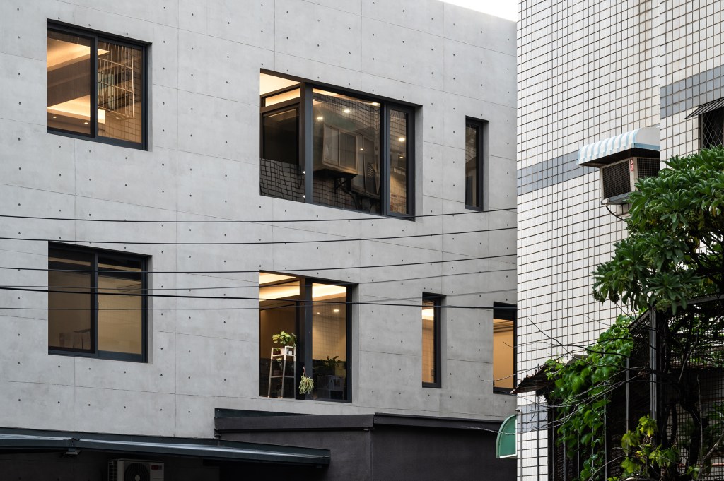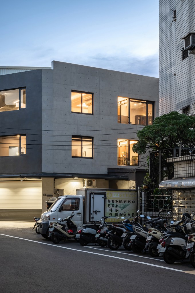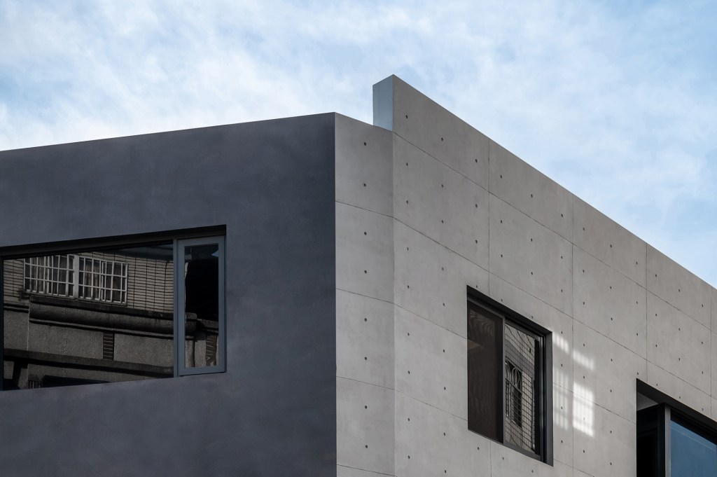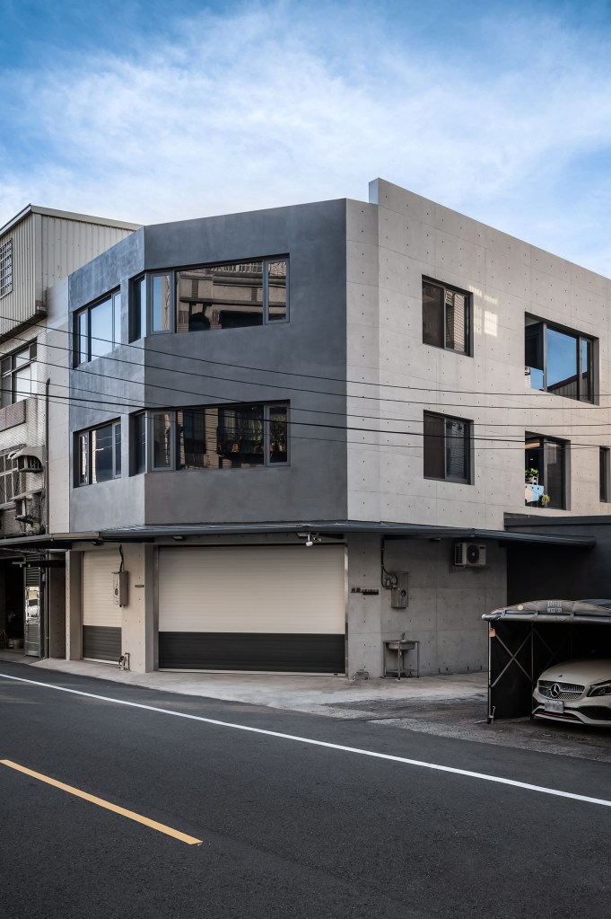 外觀以清水模呈現現代簡約風格,以低調之姿與鄰近老舊鄰房相輝映,反成街道亮點。加強原有結構,並在原有配置上調整,提升整體配置動線機能;退縮的內凹陽台,成為工作之餘,轉換心情放鬆身心的場所。