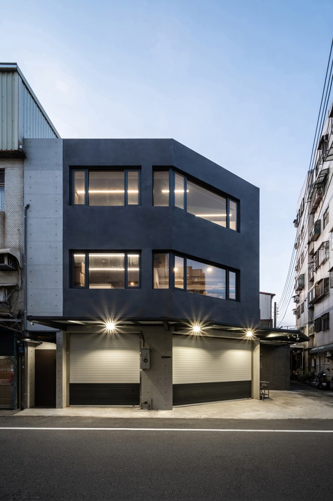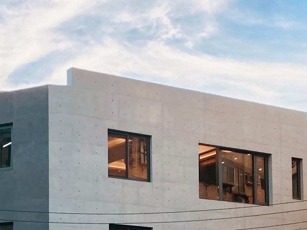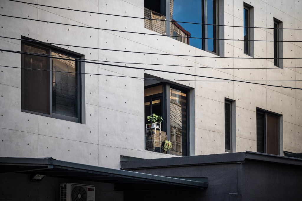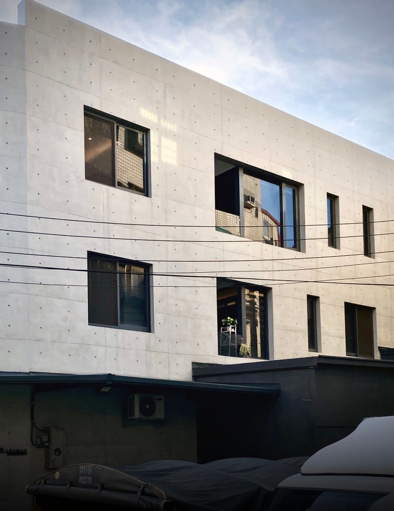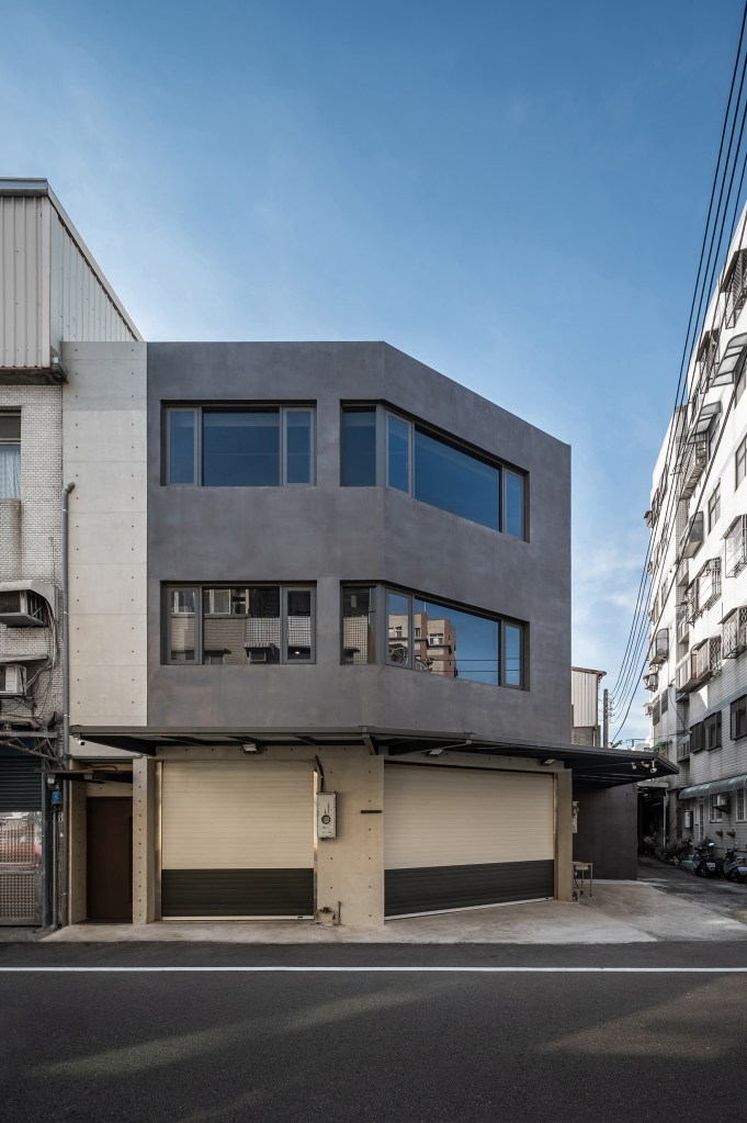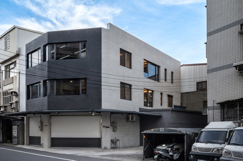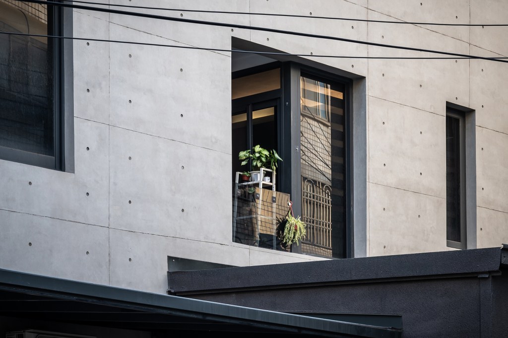 外觀以清水模呈現現代簡約風格,以低調之姿與鄰近老舊鄰房相輝映,反成街道亮點。加強原有結構,並在原有配置上調整,提升整體配置動線機能;退縮的內凹陽台,成為工作之餘,轉換心情放鬆身心的場所。