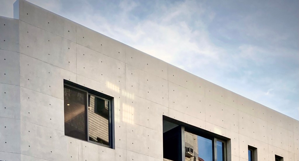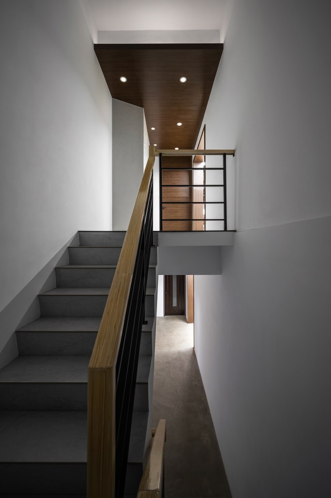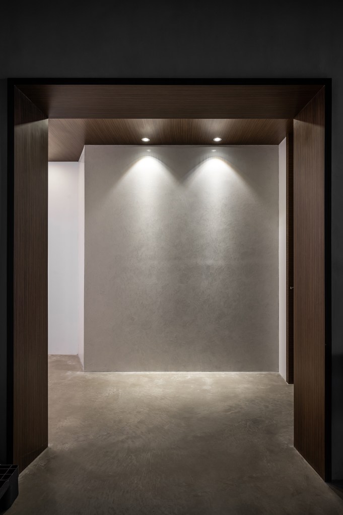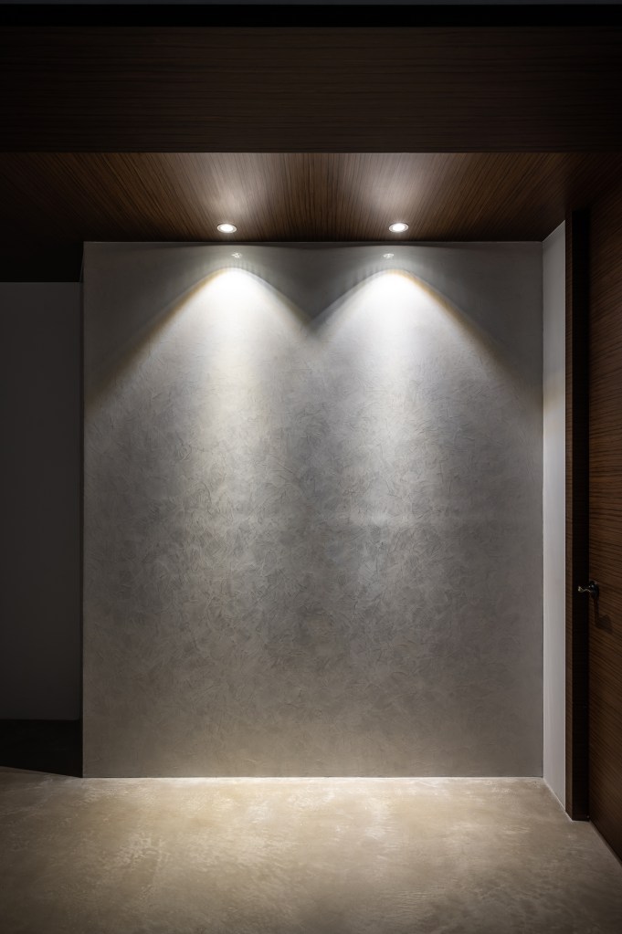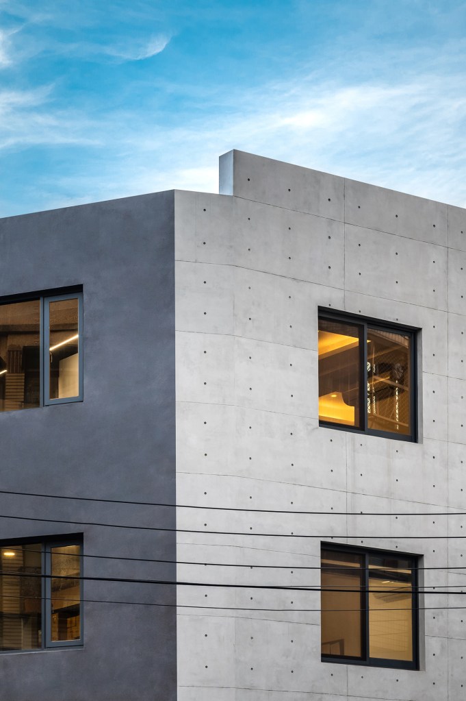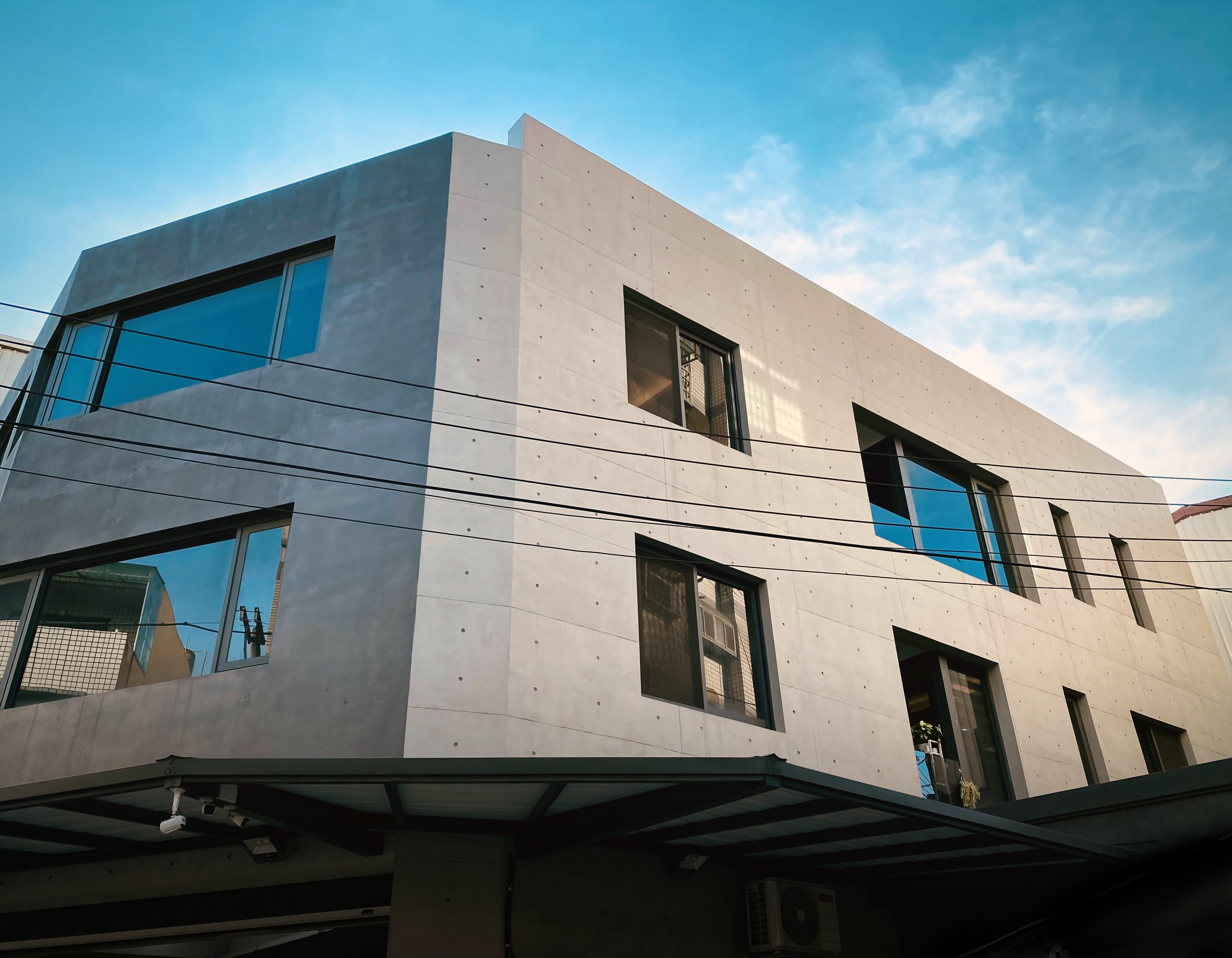 外觀以清水模呈現現代簡約風格,以低調之姿與鄰近老舊鄰房相輝映,反成街道亮點。加強原有結構,並在原有配置上調整,提升整體配置動線機能;退縮的內凹陽台,成為工作之餘,轉換心情放鬆身心的場所。