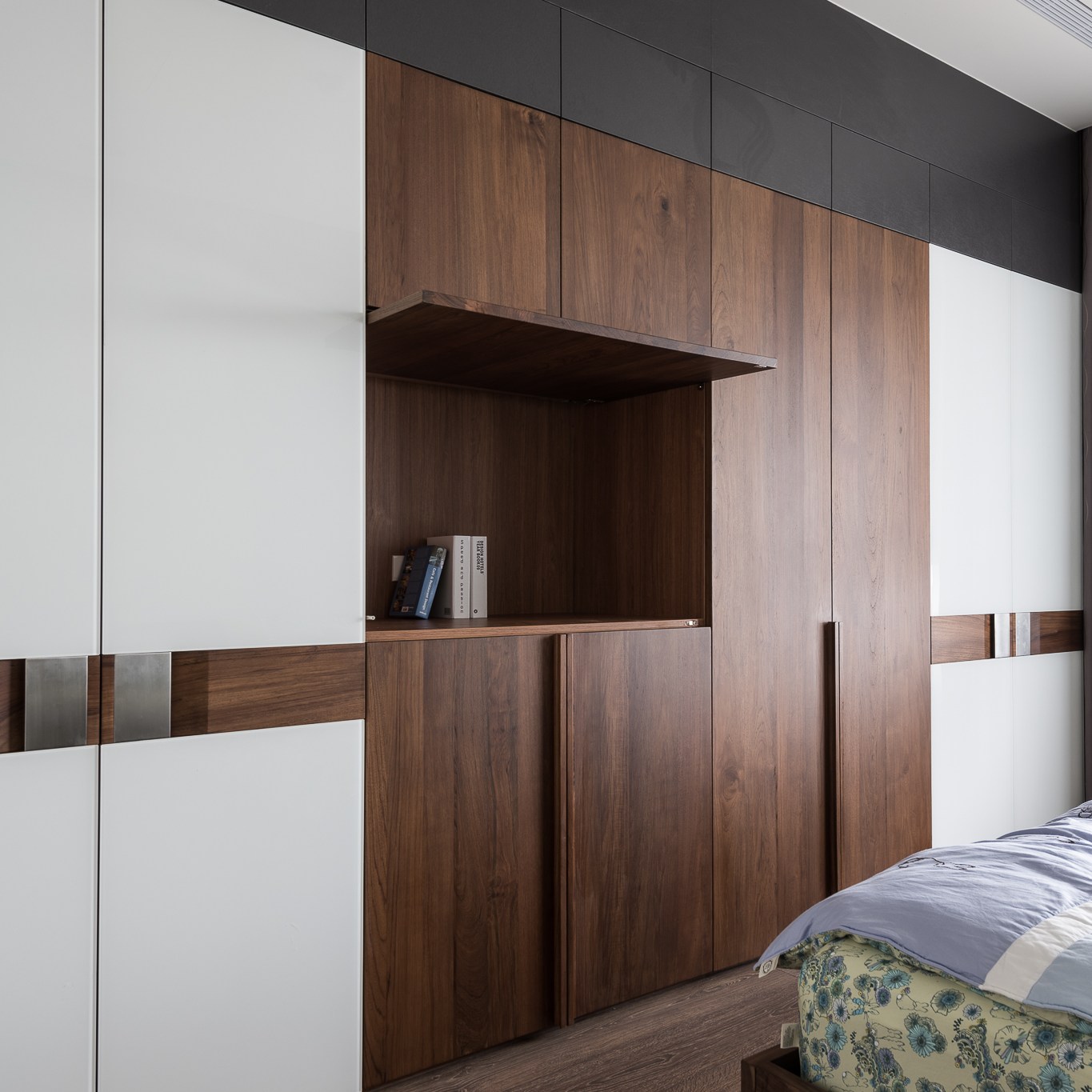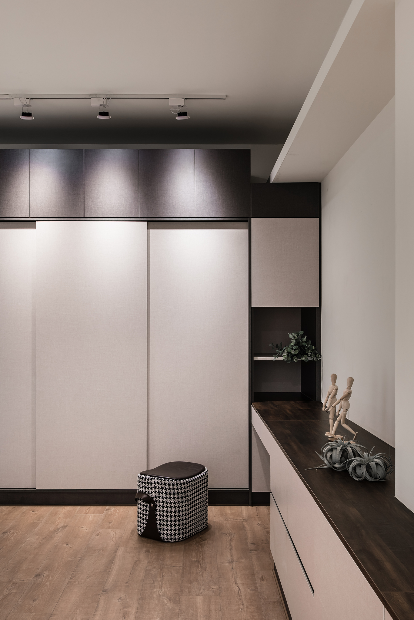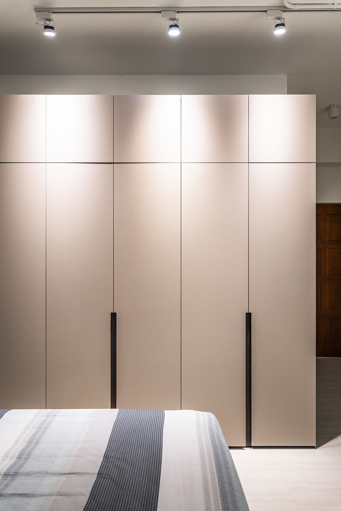 臥房根據屋主的使用習慣,規劃大量的收納櫃體,簡潔的線條跟色彩的妝點,讓櫃體即便視覺占比不小,也不會產生壓迫感,反而增強了俐落的氣氛營造。