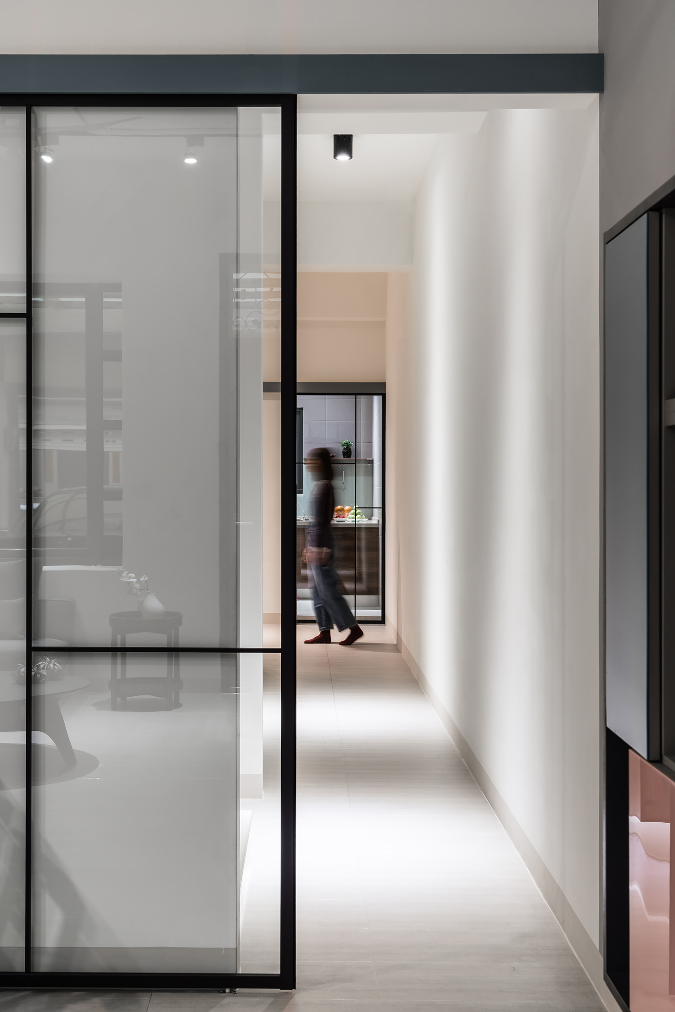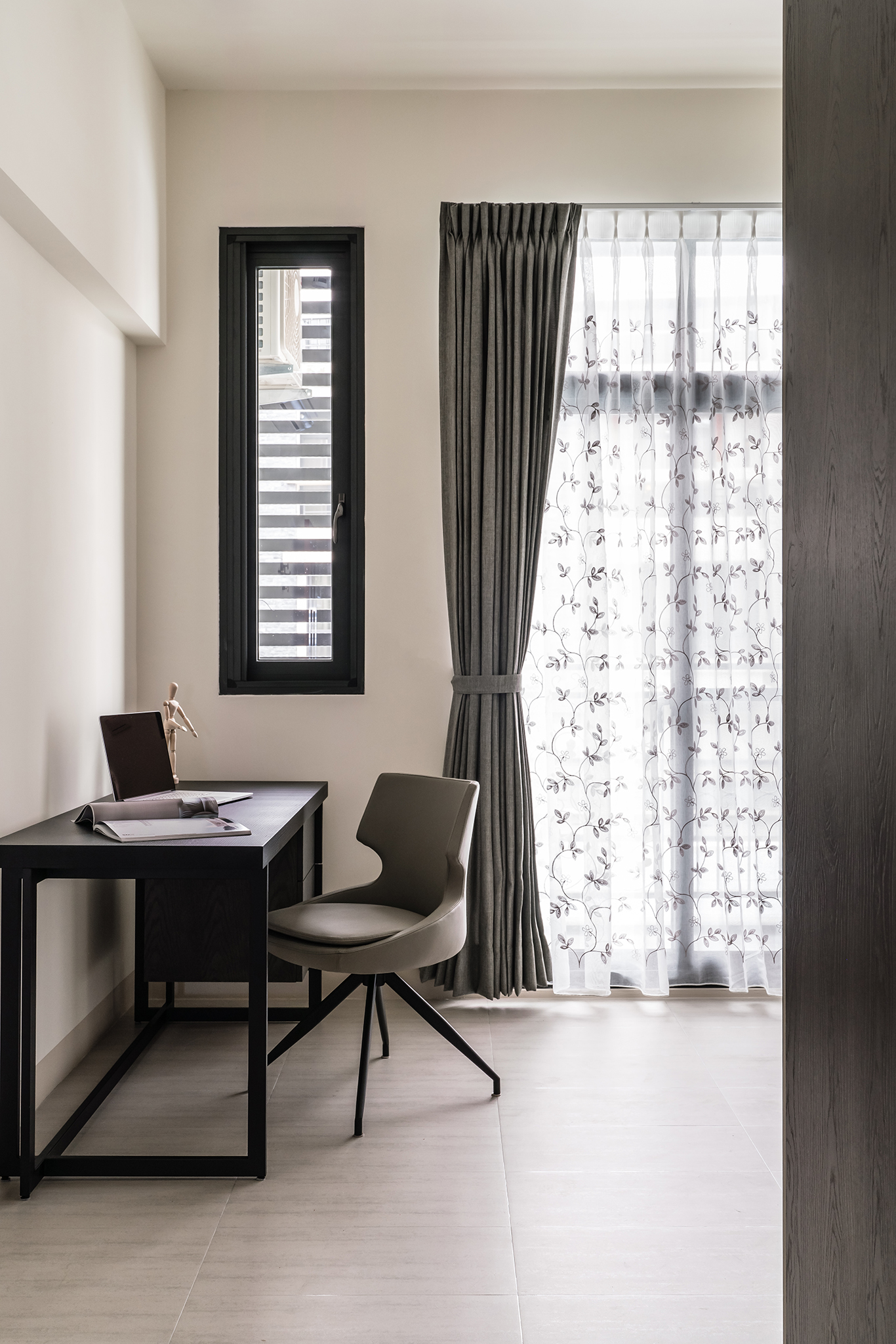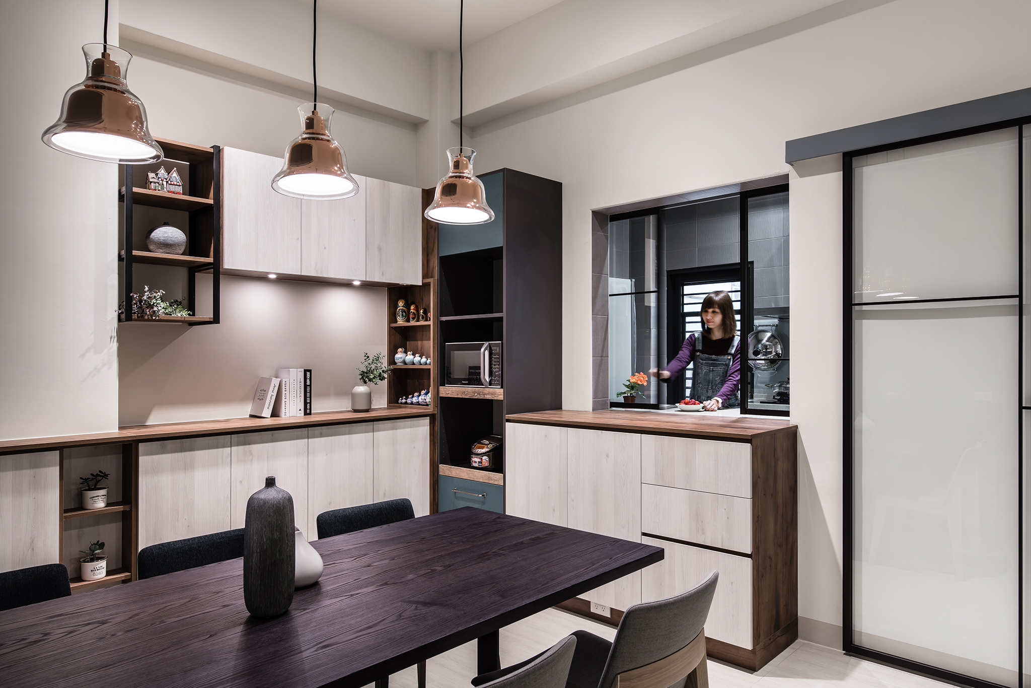當孩子休假返家時,媽媽從廚房端上一道道拿手菜,團圓在一塊分享近況,那就是最美好的光景!考量採光與空間配置後,設計師在餐廚空間選擇玻璃拉門的方式,來拉近彼此的互動距離,並設置收納機能足夠的送餐檯,方便家人傳遞手中熱騰騰的佳餚,到每一個飢腸轆轆的胃,共享和樂融融的聚餐時光。