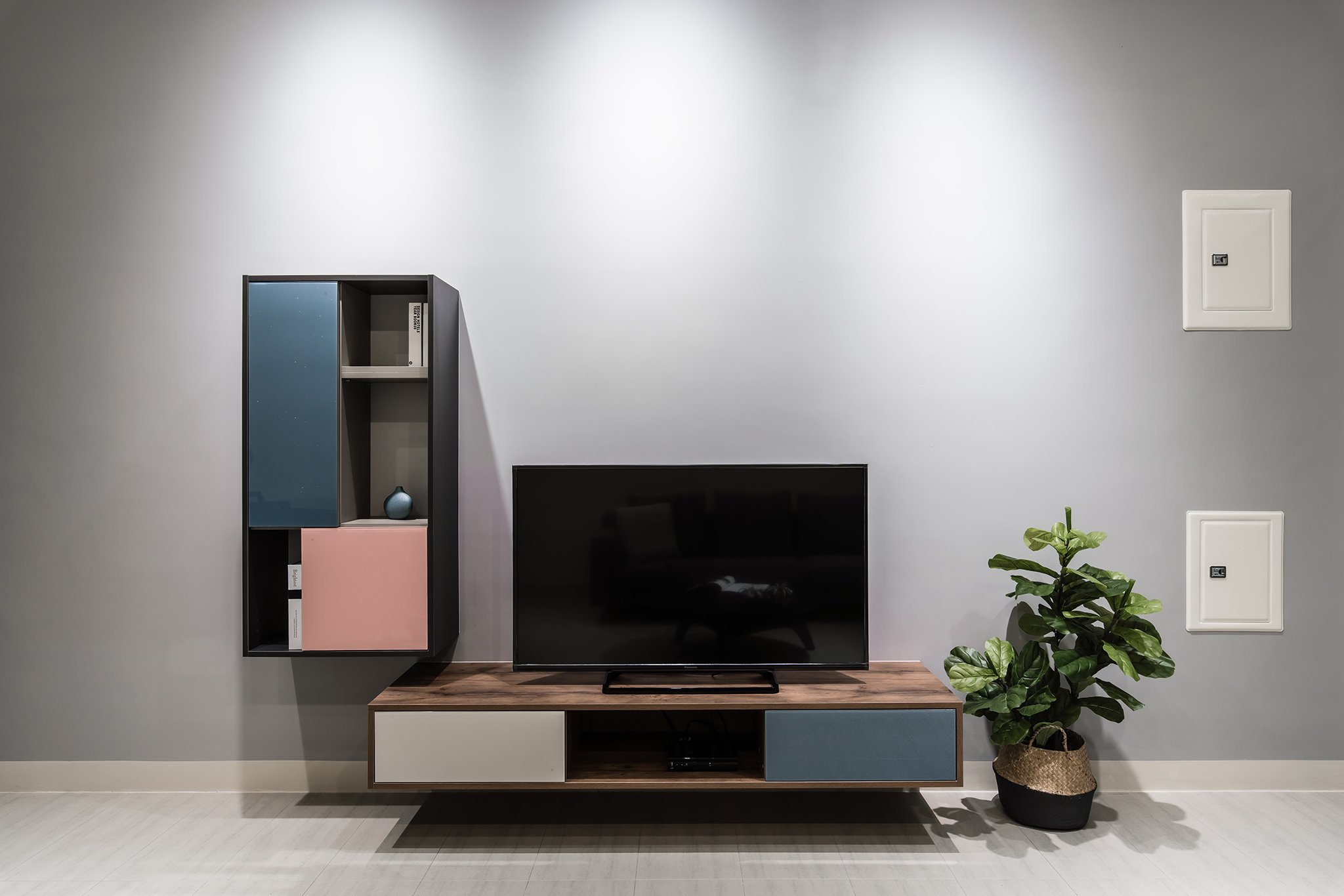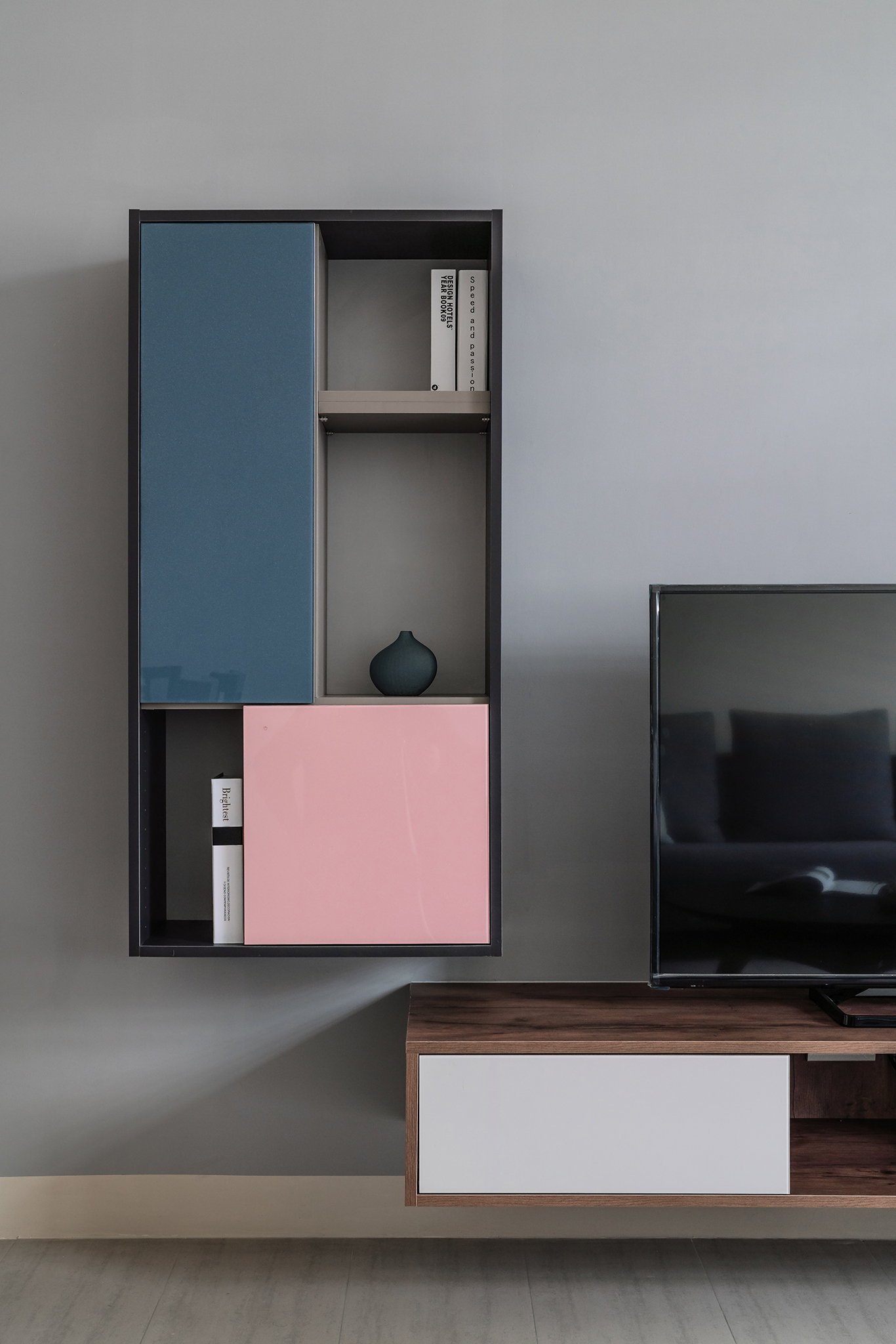 由於透天厝屬於長型空間,因此設計師在不釘天花板的前提下,搭配各個格局不同的重點光源,讓每一處都能擁有豐富的光影變化,同時維持原屋高較高的空間優勢,給人開闊明亮的居家氣息。客廳在灰色電視牆上,運用收納櫃的粉藍二色門片,彷彿塑造出一幅抽象幾何的藝術畫作,展現返璞歸真的退休美學。