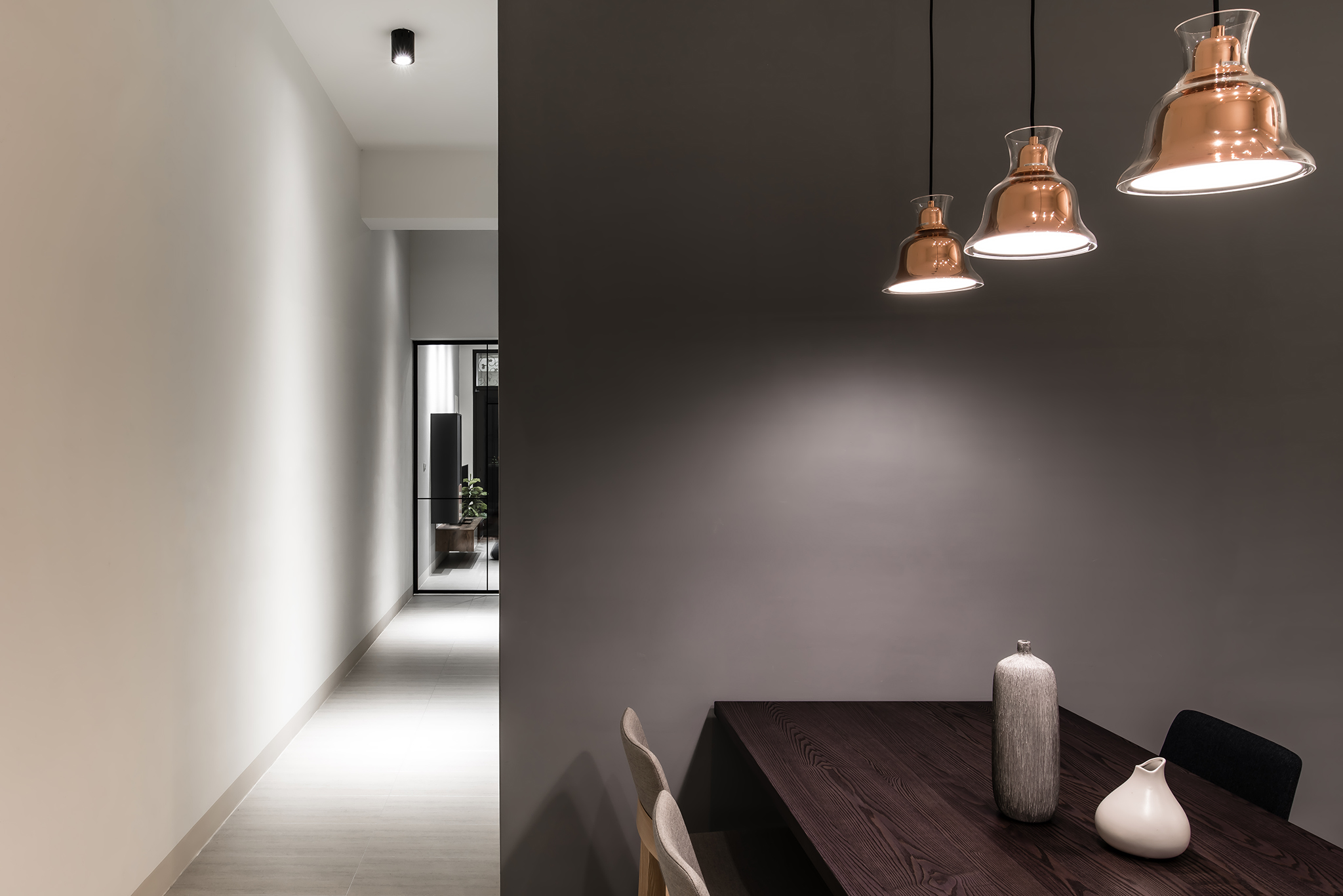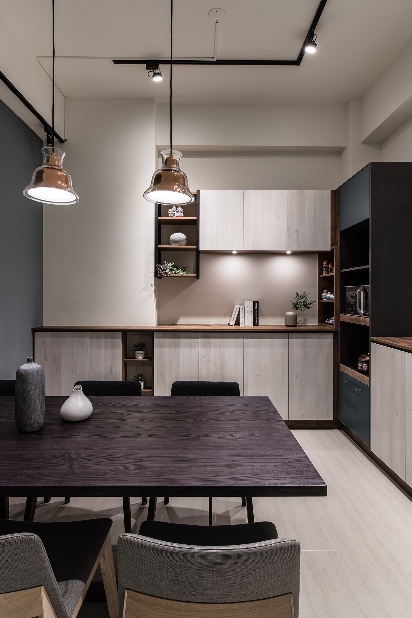 灰色牆面搭配軌道燈、金屬吊燈,詮釋帶有輕工業風的現代都會氣息。另外,為了解決長型屋空間中段採光不足的問題,設計師也刻意運用玻璃鐵件拉門作為隔間門,讓空機內的光線照明能發揮最大效能。